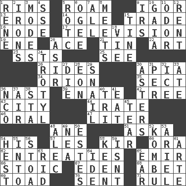 ACROSS 1. Basketball hoops 5. Wander aimlessly 9. Russian composer Stravinsky 13. Greek god of love 14. Stare at amorously 15. Swap 16. Connecting point 17. Boob tube 19. Compass dir. 20. Adept person 21. Shallow baking pan 22. Nonscientific branch of learning 23. Fast planes 25. Observe 26. Amusement-park features 30. Capital of Western Samoa 34. Constellation of myth 35. Religious group 36. Political cartoonist Thomas 39. Related on the mother's side 42. Family _ (genealogy) 43. Municipality 44. Feeling or showing extreme anger 46. Spoken 47. 61 cubic inches 48. One (Scot) 51. "____ silly question..." 54. Part of HMS, perhaps 57. French article 58. Apertif with cassis 60. Mouth or opening 62. Pleas 65. Independent ruler or chieftain 66. Unemotional 67. Paradise 68. Collude with 69. Frog relative 70. Posted 71. Court order DOWN 1. French philosopher Descartes 2. Metal shackles 3. Methods 4. Compass dir. 5. College mil. group 6. Double curve, resembling the letter S 7. 100% 8. Confronts 9. Big collection agency 10. Greek goddess of the earth (variant) 11. Scent 12. Monthly bill 15. Prong on a fork 18. Compete 20. SW Saudi Arabia district 24. Trinitrotoluene 27. Pass on 28. Period of immesurable duration 29. Slow-paced one 30. Michaelmas daisies 31. For each 32. Frozen water 33. Had dinner 36. Non-commissioned officer (abbr.) 37. Atmosphere 38. R.R. building 40. Three (prefix) 41. Erode 45. Separate forcefully 48. Actor Baldwin 49. Teachers' org. 50. _____ Park, CO 52. Dried seaweed eaten as food 53. Satellite of Uranus 54. Command 55. To the inside or interior of 56. Portico 58. Peachy ____! 59. Is not 61. Johnson of "Laugh-In" 63. To free from 64. Binary compound 65. Hearing organ