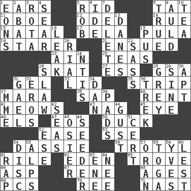 ACROSS 1. Hearing organs 5. To free from 8. Make lace 11. Mitch Miller's instrument 12. Wrote a lyric poem 14. Sorrow 15. Brizilian seaport 17. Actor Lugosi 18. Monetary unit of Botswana 19. A viewer who gazes fixedly 21. Took place subsequently 23. The 18th letter of the Arabic alphabet 25. Beverages made from leaves 26. Three-handed card game 27. Curvy letter 28. Girls' org. (abbr.) 31. Set 33. Hat (slang) 35. Remove all contents or possession from 37. Hindu Mythology: god of death 38. Plant excrement 40. Monthly bill 41. Catcalls? 43. Tired old horse 45. Sight organ 46. Raised railways 47. Greek goddess of the dawn 50. Evade 52. Relaxation 53. Compass dir. 54. Hyrax 56. TNT 61. Cause heat under the collar 62. Genesis locale 65. Collection of objects 66. Viper 67. French philosopher Descartes 68. Matures 69. Personal Computers (abbr.) 70. To riddle 71. Political cartoonist Thomas DOWN 1. Immeasurably long periods of time 2. Blind as ____ 3. Round or rotation of duties 4. Dry up 5. Director Reiner 6. Binary compound 7. Keyboard key 8. Loyal 9. Old (Scot.) 10. Beverage made from leaves 13. Natives or inhabitants of Denmark 16. Path through which fluid escapes 18. Ichor 20. Monetary unit of Yemen 22. Backtalk 24. Nuclear Threat Initiatives 26. Cole _ (cabbage dish) 28. Jennifer or Joel 29. Trig term 30. Fitting 31. Highlander 32. Greek god of love 34. One of the 12 tribes of Israel 36. Long journey 37. Madame (abbr.) 39. Groovy apts. 42. Oceans 44. Abrupt rush of wind 48. Flexible twig of a willow tree 49. Sowing specialist 51. Certainty 52. Compass dir. 54. Compact _ 55. High mountains 57. NW Algerian seaport 58. Ancient Roman robe 59. Jacques Cousteau's middle name 60. For fear that 61. Hit sharply and swiftly 63. Compass dir. 64. Born