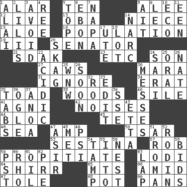 ACROSS 1. Having or resembling wings 5. "___ Little Indians" 8. Toward shelter 12. Moving, as bait 13. Chief or king in Benin or Nigeria 14. Sibling's daughter 15. _ vera 16. Census information 19. One more than two 20. Elected representative 21. Neighbor of Neb. 23. And so on (abbr.) 24. Boy, to dad 27. Crow sounds 30. Hindu Mythology: god of death 31. Dismiss 34. Part of Q.E.F. 35. Frog relative 38. Forest 40. Filth; sediment 41. Hindu god of fire 42. Annoying sounds 44. Alliance 45. False hair 46. Ocean 47. Electrical Unit 50. Russian ruler of old 53. French poetic form 57. Director Reiner 59. Conciliate 63. Farming town in central California 64. Bake eggs in their shells 65. Mountains (abbr.) 66. Among 67. Lacquered or enameled metalware 68. Plant holder 69. Zero-star reviews DOWN 1. Mountain range southwest of Kyrgyzstan 2. Ms. Damita and namesakes 3. Prevent the occurrence of 4. To separate or throw off 5. Drink excessively 6. Inky black, to poets 7. California wine valley 8. Small island 9. Flowery wreath 10. Environmental prefix 11. Car or cant ending 14. Drug cop 17. Shoshoni 18. Car dealer's back yard 20. Heroin 22. Being or containing an acid 24. Indian skirt 25. Spoken 26. Nathan's nickname 28. Compass dir. 29. Within a short period 30. Makes clutter 32. Friend of Pooh 33. Prepare for publication 35. Bar bills 36. Stare 37. Small Philippine buffalo 39. Compass dir. 43. Singer James 47. SW Saudi Arabia district 48. Was introduced to 49. Air pressure measure (abbr.) 51. Scent 52. "The Thinker" sculptor 54. Pack (down) 55. "Tell ____ the Marines!" 56. Egg locale 58. Auction offers 59. Pacific Standard Time (abbr.) 60. 17th letter of the Greek alphabet 61. Lubricate 62. Before (prefix) 63. Pet locale
