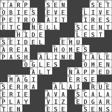 ACROSS 1. Canvas cover 5. Elected rep. 8. Arrange properly for use 11. Off-Broadway awards 13. First lady 14. Not recorded 15. Stone: prefix 16. Small island 17. Angers 18. And so on (abbr.) 19. 1994 drama film starring Jodie Foster 21. Aroma 22. Flintstone garb 24. For fear that 25. A glass for beer 27. Australian flightless bird 29. Length times width 30. Dwellings 32. Romantic infatuation 33. Place in a line 35. Falsehood 39. Stares at amorously 41. Presage 42. The first octave above the treble staff 43. Slept 45. Wise men 48. Celtic language 49. Spanish missionary in California 50. Jai ____ 52. Sorrow 55. 4th largest of the Great Lakes 56. Actress Gardner 57. Any of the three canals of the cochlea 59. Romp 60. Namely 61. _ Allan Poe 62. Nine, plus one 63. Compass dir. 64. Elected reps. DOWN 1. Drink excessively 2. Collude with 3. Actors Guy, Robert Welles, and Clint 4. For each 5. Lick closed 6. Tending to cause great harm 7. Fish or hair follower 8. Male parents of animals 9. Incident 10. Trial 12. Message 14. Louse (plural) 20. Snakelike fish 21. Change direction abruptly 23. Potato state 25. Plant excrement 26. Period 27. Period of immesurable duration 28. Madame (abbr.) 30. Part of HMS, perhaps 31. Halts 33. Everything 34. Allow 36. Electrical Measurement 37. Area sheltered from the wind 38. Conclude 40. Greek goddess of the earth (variant) 43. Teachers' org. 44. Originate 45. Haggard of country music 46. Believer in; advocate of (suffix) 47. Jennifer or Joel 49. Back-to-school mo. 50. Advice 51. Goldbrick 53. ____ Bator, Mongolia 54. Hearing organs 56. "___ Maria" 58. Music discs