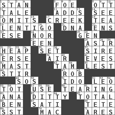 ACROSS 1. Comedian Laurel of Laurel & Hardy 5. Enemy 8. Baseball player Mel 11. Falsehood 12. Sums up 14. Observe 15. Leaves out 17. Small stream 18. Beverage made from leaves 19. Small, flat, pigmented spot on the skin 21. Heredity factor (abbr.) 22. Followers of ems 23. Compass dir. 24. And not 25. Commissioned military rank (abbr.) 27. Car or cant ending 28. SW Saudi Arabia district 31. Pile 35. Arrange properly for use 37. Father 38. Celtic language 39. Atmosphere 41. Nights before holidays 42. Vertical spar for supporting sails 43. Scottish cap 45. For fear that 46. Agitate 47. Director Reiner 49. Mayday 51. Wedding promise 52. Lion 55. Small child 57. Purpose 60. Pulling apart 62. Santa ___, CA 63. Short, simple song 65. "_____ Recall" 66. Benjamin's nick name 67. Suttee (variant) 68. False hair 69. Fast jet (abbr.) 70. Big _ 71. Ancient Greek god of war DOWN 1. Took without asking 2. Softens 3. Place in a line 4. Remaining after all deductions 5. Distant 6. Wrote a lyric poem 7. Paradise 8. Clearly or manifestly demonstrative 9. Adolescent 10. Afternoon social gatherings 13. Heroin 16. Trig term 17. Pupil covering 20. Moves 26. Artist's stand 29. Angers 30. State of inaction 31. Is hesitant and indecisive 32. Part of Q.E.F. 33. Helper 34. Stone: prefix 36. Teat (slang) 40. Noteworthy scarcity 44. Method 48. Water vessel 50. Beer foam 52. 61 cubic inches 53. Related on the mother's side 54. Stares 55. Bar bills 56. Washington bills 58. Thailand, formerly 59. Singer James 61. Roll call or roster of names 64. Nervous spasm