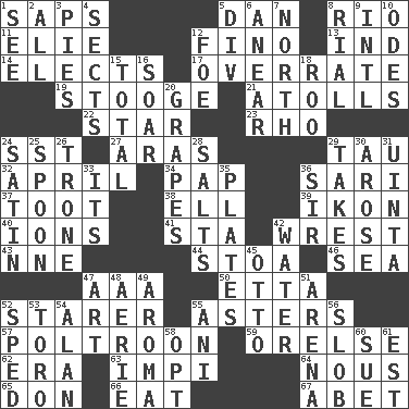 ACROSS 1. Plant excrements 5. One of the 12 tribes of Israel 8. River (Sp.) 11. Writer Wiesel 12. A pale, very dry sherry 13. Working for oneself (abbr.) 14. Opts 17. Make much ado about nothing 19. Moe Howard, for one 21. Ringlike coral islands and reefs 22. Play the lead 23. 17th letter of the Greek alphabet 24. Fast jet (abbr.) 27. Caspian sea tributary 29. The 19th letter of the Greek alphabet 32. Showery time 34. Infant food 36. Indian skirt 37. A blast of a horn 38. Pipe bend 39. Image 40. Charged particles 41. R.R. building 42. Obtain by seizing forcibly or violently 43. Compass dir. 44. Portico 46. Ocean 47. American Automobile Association (abbr.) 50. Singer James 52. A viewer who gazes fixedly 55. Michaelmas daisies 57. Coward 59. Threatening words 62. Epoch 63. Body of Kaffir warriors 64. Good sense 65. Spanish title 66. Consume 67. Collude with DOWN 1. Observe 2. 100% 3. Sliced desserts 4. Religious groups 5. HTML Container Element 6. Approach 7. 0 degrees 8. Monetary unit of Yemen 9. International (abbr.) 10. Lyric poems 12. Enemy 15. "_____ Recall" 16. Fly high 18. Friend of Pooh 20. Raisin fruits 24. Smooth fabric 25. Soup utensil 26. Marketplace scale 28. Table seasonings 29. Proceeds 30. Came up 31. National forest in Provo, Utah 33. It is 35. Food holders 36. Title for a knight 42. Wetness 45. "Beetle Bailey" pooch 47. Tate display 48. Nest on high 49. Odor 51. Sports stadium 52. Moved rapidly 53. "Corrida" creature 54. ____ Jay Lerner 55. Cuckoo 56. Messy guy 58. Elect 60. Take to court 61. Eastern Standard Time (abbr.)