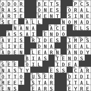ACROSS 1. Aroma 5. Wagers 9. Personal Computers (abbr.) 12. Raze (variant) 13. Washington bills 14. Spoken 15. Johnson of "Laugh-In" 16. Gone 17. Trig term 18. Observe 19. Everything 21. Roamer 22. Grandmother 24. Adept person 26. Raised railways 27. Slender Brazilian palm 28. Inside; within (prefix) 29. Advice 30. Amusement-park features 32. Naughty children 36. Not recorded 37. Heredity factor (abbr.) 38. Anneal 39. An important port of Yemen 40. Memorize 42. "60 Minutes" Commentator Rooney 43. Prejudice 44. Watches over 46. Turn to the right 49. Petroleum 50. It may be bright or harebrained 51. Difficult 53. Curvy letter 54. Automobile 57. Von Bismarck 58. One who uses or employs something 61. "You Light Up My Life" star Conn 62. Confront 63. Play the lead 64. Slanted text style (abbr.) 65. Followers of ems 66. Hearing organs 67. Jane of fiction DOWN 1. Mouths or openings 2. Have the gumption 3. Clearly or manifestly demonstrative 4. To riddle 5. Soup holder 6. Compass dir. 7. "___ Little Indians" 8. Fast jet (abbr.) 9. First class 10. Lessep's creation 11. Bobsleighs 14. Bear (Spanish) 19. Santa ___, CA 20. Den 21. Modern: prefix 23. NE Netherlands city 24. Approach 25. Music discs 27. Enthusiastic 28. Ferber et al. 29. In the manner of 31. Standard of perfection 32. Silly 33. Ananias' fault 34. Groovy apts. 35. Insidious 40. Cards in a Roman deck? 41. Nuclear Threat Initiatives 43. Male child 45. Begley and Asner 46. Dwarf 47. Ingested 48. _____ Park, CO 52. Small child 53. Blunders 55. The sixth month of the Jewish calendar 56. Cause heat under the collar 58. Purpose 59. R.R. building 60. Ewer handle 61. Expire