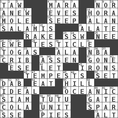 ACROSS 1. The 23rd letter of the Hebrew alphabet 4. Hindu Mythology: god of death 8. And not 11. Afresh 13. Nights before holidays 14. Israeli folk dance 15. Undercover agent 16. Ooze 17. Actor Alda or Thicke 18. Deli grouping 21. Having winglike extensions 22. Libertine 23. Compass dir. 25. Born 26. She-sheep 29. A testis 32. Ancient Roman robes 34. Insect wing 35. Basketball assoc. 38. Baby bed with high sides 39. NE Netherlands city 41. Went 43. Compass dir. 44. Allow 45. Removes the wrinkles 46. Storms 50. Put into a specified state 51. Pat or tap gently 54. Consume 55. Land elevation 57. Perfect 59. Pertaining to the sea 63. Thailand, formerly 64. Ballerina skirt 67. Yard entry 68. Root beer relative 69. A single undivided whole 70. Coast Guard woman 71. Compass dir. 72. Sliced desserts 73. The first octave above the treble staff DOWN 1. Scottish caps 2. Small Philippine buffalo 3. Water source 4. Makes clutter 5. "___ Maria" 6. To sift 7. Viper 8. Pitcher Ryan 9. Speak pompously 10. The wife of a rajah (variant) 12. Erode 14. Actor Linden 19. Floor coverings 20. Mamie's mate 21. Leather borer 23. Filth; sediment 24. Glance over 26. And so on (abbr.) 27. Had on 28. The front part of a cuirass 30. Clothes sense 31. Engineer (abbr.) 33. Collude with 36. Scornful sounds 37. Singer Murray 39. _ mater 40. Back-to-school mo. 42. Eastern Standard Time (abbr.) 45. Small island 47. Snakelike fish 48. Yells 49. Nervous spasm 51. Flat circles 52. Goodbye (Sp.) 53. Memphis, Tenn. Street 56. Straggles 58. Nanny (var.) 60. California wine valley 61. Slanted text style (abbr.) 62. Sure thing 64. Uncastrated adult male sheep 65. Corn or form start 66. Neckwear