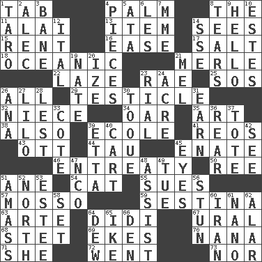 ACROSS 1. Keyboard key 4. Inside of hand 8. Definite Article 11. Jai ____ 13. A distinct part 14. Observes 15. Monthly bill 16. Comfort 17. Table seasoning 18. Pertaining to the sea 21. Haggard of country music 22. Goldbrick 23. Actress Charlotte 25. Mayday 26. 100% 29. One of the two male reproductive glands 32. Sibling's daughter 34. Boat paddle 35. Tate display 38. In addition 39. Learning spot: Fr. 41. Vintage cars 43. Baseball player Mel 44. The 19th letter of the Greek alphabet 45. Maternal 46. Plea 50. To sift 51. A saturated hydrocarbon 54. Feline 55. Institutes legal proceedings 57. With motion or animation 59. French poetic form 63. Johnson of "Laugh-In" 64. "You Light Up My Life" star Conn 67. Mountain range 68. Proofreading order 69. Makes supply last 70. Nanny 71. A female animal or person 72. Left 73. Not either DOWN 1. Pacific island yam 2. Actor Baldwin 3. Object of repulsion 4. Parts 5. _ moment's notice (2 wds.) 6. French article 7. Madame (abbr.) 8. Lacerates 9. Phone greeting 10. _____ Park, CO 12. Slanted text style (abbr.) 14. Compass dir. 19. Nathan's nickname 20. Ending with capital 21. Cartoonist voice _ Blanc 23. Monetary unit of Yemen 24. Land measure 26. Santa ___, CA 27. _ and Stitch 28. For fear that 30. Woman's close-fitting hat 31. Merit 33. ____ d'Azur (French Riviera) 36. Stern 37. Haul 39. Singer James 40. Haul 42. Perceive with the eye 45. Sight organs 47. Non-commissioned officer (abbr.) 48. Help 49. Third day of the wk. 51. Collect or gather 52. 0 degrees 53. First name in cosmetics 56. Surprise greatly 58. Put into a specified state 60. SW Asia republic 61. Billionth: prefix 62. Having or resembling wings 64. Morning condensation 65. Mamie's mate 66. Lair