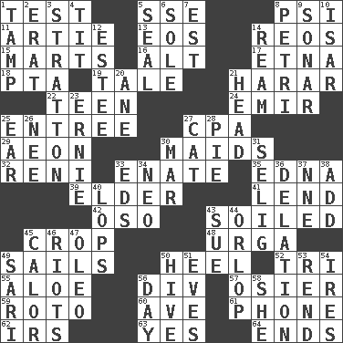 ACROSS 1. Trial 5. Compass dir. 8. 23rd letter of the Greek alphabet 11. Nick name for Arthur 13. Greek goddess of the dawn 14. Vintage cars 15. Shops 16. The first octave above the treble staff 17. Inactive volcano in Sicily 18. Parent Teacher Association (abbr.) 19. Story 21. Ethiopian city, capital of Harari 22. Adolescent 24. Arab leader 25. Main course 27. Numbers guy (abbr.) 29. Age 30. Women servants 32. Painter Guido (1575-1642) 33. Related on the mother's side 35. Pulitzer Prize-winning author Ferber 39. A person who is older than you are 41. Grant temporary use of 42. Bear (Spanish) 43. Dirtied 45. Riding implement 48. Capital and largest city of Mongolia 49. Travel by water 50. The bottom of a shoe or boot 52. Three (prefix) 55. Medicinal plant 56. HTML Container Element 57. Flexible twig of a willow tree 59. Printing process, for short 60. "___ Maria" 61. Give a jingle 62. Big collection agency 63. Consenting reply 64. Extremities DOWN 1. Pack (down) 2. Part of Q.E.F. 3. Ski resort town in Vermont 4. Teat (slang) 5. Lick closed 6. Not divided or shared with others 7. Eastern Standard Time (abbr.) 8. _ dish (used to culture cells) 9. Underwater navigation system 10. Austrian river, tributary to the Danube 12. First name in cosmetics 14. 480, 500 or 516 sheets of paper 20. One (Scot) 21. Froth on beer 23. Bert's buddy 25. Ewer handle 26. Born 27. Feline 28. Sliced dessert 30. Third mo. 31. Former Milwaukee Brewers owner Bud 33. Begley and Asner 34. Modern: prefix 36. Conveyance 37. Compass dir. 38. Find the sum of 40. Chops off 43. Take to court 44. Lowest deck of a ship 45. Bodily heat indicating an inflammation 46. Debaucheries 47. Margarine 49. Indian skirt 50. Hub of activity 51. Nights before holidays 53. Tear apart 54. Angers 56. 24 hours 58. A female animal or person