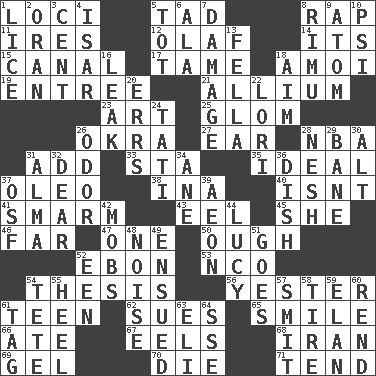 ACROSS 1. Locales 5. Bit 8. Hit sharply and swiftly 11. Angers 12. Norwegian king 14. It is 15. Lessep's creation 17. Docile 18. Mine, in Marseilles 19. Main course 21. Plant genus of onion and garlic 23. Nonscientific branch of learning 25. Take by theft 26. Gumbo ingredient 27. Hearing organ 28. Basketball assoc. 31. Find the sum of 33. R.R. building 35. Perfect 37. Butter sub 38. _ tizzy (2 wds.) 40. Is not 41. Excessive but superficial compliments 43. Snakelike fish 45. A female animal or person 46. Distant 47. Single 50. Ending for "Through" and "Enough" 52. Inky black, to poets 53. Non-commissioned officer (abbr.) 54. College paper 56. Last past 61. Adolescent 62. Takes to court 65. Grin 66. Had dinner 67. Snakelike fish 68. SW Asia republic 69. Set 70. Expire 71. Watch over DOWN 1. Louse (plural) 2. NW Algerian seaport 3. Penny 4. Austrian river, tributary to the Danube 5. Small child 6. In the manner of 7. Break 8. Tall New Zealand timber tree 9. Smallest unit of an element 10. 23rd letter of the Greek alphabet 13. Chap (slang) 16. Path through which fluid escapes 18. Direct toward a target or goal 20. Blunders 22. Australian parrot (variant) 24. Jacques of French films 26. Aroma 28. Tender 29. Object of repulsion 30. The first octave above the treble staff 31. _ mater 32. Letter starter 34. One (Scot) 36. Food container 37. Order of Saint Francis (abbr.) 39. A really long time 42. Disorderly crowds 44. "I Love _" 48. Annoying sound 49. Followed as a consequence or result 51. Moves 52. Car or cant ending 54. False hair 55. Person who is morally reprehensible 57. Stricken, poetically 58. Hoop that covers a wheel 59. Enthusiasm 60. Tear apart 61. Label 63. Connecticut Ivy Leaguer 64. Compass dir.