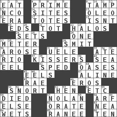 ACROSS 1. Consume 4. First class 9. Pack (down) 13. Non-commissioned officer (abbr.) 14. Settings 15. Margarine 16. Period 17. Lugs 18. Is not 19. Begley and Asner 21. Small child 22. Radiant circles of light 24. Arranges properly for use 26. Single 27. Distance measurement 29. Stricken, poetically 30. Came up 31. Ubangi River tributary 33. Had dinner 36. _ de Janeiro 37. Smoochers 40. Ocean 41. Snakelike fish 42. Moved rapidly 43. Fertile tracts in a desert 45. Snakelike fish 47. Place in a line 48. Actress Charlotte 49. Greek god of love 50. Derisive sound 52. Layer 54. And so on (abbr.) 56. Passed on 57. Pitcher Ryan 59. Sandy's bark 61. Otherwise 62. Declaim 63. Teachers' org. 64. Soaks 65. The wife of a rajah (variant) 66. Nine, plus one DOWN 1. Compass dir. 2. 43,560 square feet 3. Inedible or poisonous agaric 4. Pacific Standard Time (abbr.) 5. Debaucheries 6. "Tell ____ the Marines!" 7. Rendezvous 8. Double-curved letter 9. Bathroom plumbing fixture 10. In addition 11. Not women's 12. Cooking vessel 20. Perceives with the eye 22. Home run 23. Cuckoo 25. Long journey 27. Female horse 28. One of the Great Lakes 29. Downhill vehicle 31. United States Postal Service (abbr.) 32. Compass dir. 33. Helper 34. Adolescent 35. Comfort 38. Small island 39. Fly high 44. Medicinal plant 45. Eats (away) 46. Ewer handle 49. Maternal 50. Filth; sediment 51. A home for chicks 52. Israeli folk dance 53. Enthusiasm 55. Algonquian 56. Morning condensation 57. And not 58. Born 60. Avid follower