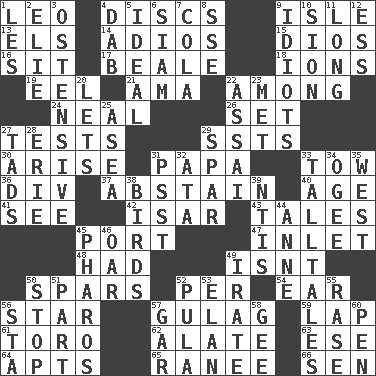 ACROSS 1. Lion 4. Flat circles 9. Capri or Wright 13. Raised railways 14. Goodbye (Sp.) 15. "Vaya con ____" 16. Be seated 17. Calif. Air Force Base 18. Charged particles 19. Snakelike fish 21. Nanny (var.) 22. Amid 24. Actress Patricia 26. Arrange properly for use 27. Trials 29. Fast planes 30. Originate 31. Dad 33. Pull behind 36. HTML Container Element 37. Choose not to consume 40. Mature 41. Observe 42. Austrian river, tributary to the Danube 43. Lies 45. Sweet dark-red dessert wine 47. An arm off of a larger body of water 48. Possessed 49. Is not 50. Practice fights 52. For each 54. Hearing organ 56. Play the lead 57. Russian prison camp 59. Infant locale 61. "Corrida" creature 62. Having winglike extensions 63. Compass dir. 64. Flats, for short 65. The wife of a rajah (variant) 66. Elected rep. DOWN 1. French article 2. Writer Wiesel 3. Clearly or manifestly demonstrative 4. Small moist lump or mass 5. Standard of perfection 6. Thailand, formerly 7. Root beer relative 8. Compass dir. 9. Foolish or stupid persons 10. The Jewish people; Israel 11. Yearn 12. Curvy letter 20. Allows 22. Slender Brazilian palm 23. Was introduced to 25. At sea 27. Small amounts or degrees 28. 4th largest of the Great Lakes 29. Practice fight 31. Inconspicuous attention getter 32. "One Day ___ Time" 33. Baron Munchausen's specialties 34. Double curve, resembling the letter S 35. 270 degrees 38. Avian creatures 39. Nuclear Threat Initiatives 44. Queen of England 1702-14 45. N Egypt peninsula 46. Boat paddle 49. Feeling or showing extreme anger 50. Discontinue 51. Component 52. Monetary unit of Botswana 53. Flair 55. Raze (variant) 56. R.R. building 57. Slender fish 58. Unit of force equal to gravity 60. Fenced enclosure