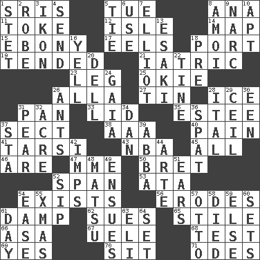 ACROSS 1. Indian titles of respect 5. Third day of the wk. 8. Santa ___, CA 11. Puff or smoke 12. Capri or Wright 14. Atlas unit 15. Dark wood 17. Snakelike fish 18. Sweet dark-red dessert wine 19. Watched over 21. Of or pertaining to medicine 23. Part of a journey 25. Migrant worker of the '30s 26. Silent film actress Nazimova 27. Metal container 28. Frozen water 31. Baking dish 33. Flaplike covering 35. First name in cosmetics 37. Religious group 38. American Automobile Association (abbr.) 40. Ache 41. Tarsus (plural) 43. Basketball assoc. 45. 100% 46. "We ___ not amused" (Victoria) 47. Madame (abbr.) 50. Cy Young winner Saberhagen 52. Connect, as a bridge 53. _ moment's notice (2 wds.) 54. Is extant 56. Eats (away) 61. Moist 62. Takes to court 65. Vertical member of a panel or frame 66. White ___ sheet 67. Ubangi River tributary 68. Trial 69. Consenting reply 70. Be seated 71. Lyric poems DOWN 1. Proofreading order 2. Loose flowing garment 3. Picture 4. Transmit 5. Neckwear 6. Purpose 7. American author Paul (1891-1958) 8. Mine, in Marseilles 9. Drug cop 10. Fitting 13. 1973 Nobel Price Winner (Physics) Leo 16. Shout 18. Before (prefix) 20. Small valley 22. Prong on a fork 24. Greek goddess of the earth (variant) 26. Pismires 28. Slanted text style (abbr.) 29. To provide with a ceiling 30. Car or cant ending 31. Lightbulb-shaped fruit 32. Measure of real estate 34. Daniel's nick name 36. Petty quarrel 37. R.R. building 39. Swedish rock group 42. Naughty children 44. Johnson of "Laugh-In" 48. Taiwanese island in East China Sea 49. Follows as a consequence or result 51. Hearing organs 52. Small drink 54. Relaxation 55. Dec. holiday 57. Von Bismarck 58. Passed on 59. Otherwise 60. Arranges properly for use 61. 24 hours 63. Biblical high priest 64. Put into a specified state