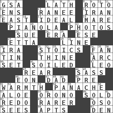 ACROSS 1. Girls' org. (abbr.) 4. Thin strip of wood or metal 8. Printing process, for short 12. Followers of ems 13. The wife of a rajah (variant) 14. SW Asia republic 15. Compass direction 17. Standard of perfection 18. Female horse 19. Player piano 21. Pictures 23. Take to court 24. Epoch 26. Compass dir. 27. Singer James 28. Actor's bit 30. Lyricist Gershwin 31. Unemotional ones 34. Avid follower 37. Shallow baking pan 38. One or ones belonging to thee 39. Curve 40. Put into a specified state 41. Dirtied 42. Lion 43. Rump 44. Backtalk 46. A really long time 47. Male parent 50. Before (prefix) 51. Heat 54. Flamboyance 57. Medicinal plant 58. U. of Maine site 60. Disposed of to a purchaser 62. Redecorate 63. Less widely known 64. Bear (Spanish) 65. Observes 66. Flats, for short 67. Lair DOWN 1. Turn to the right 2. Fastener 3. Aide 4. Dipping utensil 5. Approach 6. Beverage made from leaves 7. Aid 8. Full of chinks, cracks, or crevices 9. Declaim 10. Edible starchy tuberous root 11. Washington bills 13. River (Sp.) 16. Pulled tight 20. Teachers' org. 22. Coop moms 25. Place in a line 27. 4th largest of the Great Lakes 29. On the rocks 30. ___ a Wonderful Life 31. Portico 32. One of three equal parts 33. Lubricate 34. It jiggles the polygraph 35. Ancient Greek god of war 36. Non-commissioned officer (abbr.) 41. Emitted 43. Lover boys 44. Health resort 45. Curves 46. Eat (away) 48. To the left, to Queeg 49. Natives or inhabitants of Denmark 51. Armed conflicts 52. Toward shelter 53. Israeli folk dance 55. Not either 56. Otherwise 59. Strike 61. Spanish title