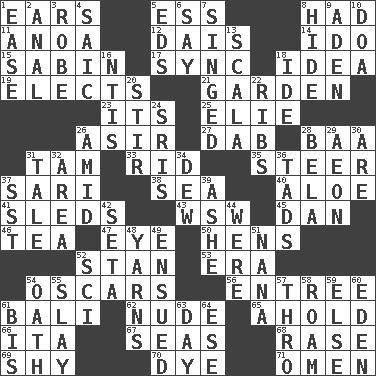 ACROSS 1. Hearing organs 5. Curvy letter 8. Possessed 11. Small Philippine buffalo 12. Raised platform 14. Wedding promise 15. Unit of acoustic absorption 17. Synchronize (abbr.) 18. The main thing one is thinking about 19. Chooses 21. Place where plants grow 23. It is 25. Writer Wiesel 26. SW Saudi Arabia district 27. Small moist lump or mass 28. Sound made by sheep 31. Scottish cap 33. To free from 35. Navigate 37. Indian skirt 38. Ocean 40. Medicinal plant 41. Bobsleighs 43. Compass dir. 45. One of the 12 tribes of Israel 46. Afternoon social gathering 47. Sight organ 50. Coop moms 52. Comedian Laurel of Laurel & Hardy 53. Period 54. Motion picture awards 56. Main course 61. Indonesian resort city 62. Naked 65. Hold, grip (Informal) 66. Call ___ day 67. Oceans 68. To erase 69. Like a shrinking violet 70. Color 71. Presage DOWN 1. Comfort 2. Of or related to the anus 3. Loose flowing garment 4. Ketch in the Levant 5. Begley and Asner 6. Declare 7. Burned superficially 8. Flintstone garb 9. An important port of Yemen 10. ___ good deed 13. Any of the three canals of the cochlea 16. Nuclear Threat Initiatives 18. Binary compound 20. Commotion 22. Chest bones 24. Indian titles of respect 26. Among 28. Actor Lugosi 29. Age 30. "We ___ not amused" (Victoria) 31. Lie 32. Length times width 34. Morning condensation 36. Small amounts or degrees 37. Fast jet (abbr.) 39. American tennis player Robert 42. Bristle 44. We are 48. Tall tales 49. Followed as a consequence or result 51. Grandmother 52. _-fi 54. Pledge 55. Kill 57. Through, poetically 58. Wander 59. Otherwise 60. Genesis locale 61. Twice 63. 24 hours 64. Compass dir.