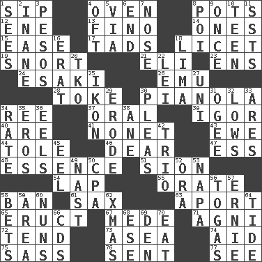 ACROSS 1. Small drink 4. Baking chamber 8. Plant holders 12. Compass dir. 13. A pale, very dry sherry 14. Washington bills 15. Comfort 17. Bits 18. It is permitted: Lat. 19. Derisive sound 21. Biblical high priest 23. Followers of ems 24. 1973 Nobel Price Winner (Physics) Leo 26. Australian flightless bird 28. Casino tip 30. Player piano 34. To separate or throw off 37. Taken by mouth 39. Russian composer Stravinsky 40. "We ___ not amused" (Victoria) 41. Music written for nine 43. She-sheep 44. Lacquered or enameled metalware 46. Letter starter 47. Curvy letter 48. Center 51. The Jewish people; Israel 54. Infant locale 55. Declaim 58. Forbid 61. Saxophone 63. To the left, to Queeg 65. Spew [out] 67. Ancient Persian 71. Hindu god of fire 72. Look after 73. At sea 74. Help 75. Backtalk 76. Emitted 77. Perceive with the eye DOWN 1. Perceives with the eye 2. Empty; void 3. Mexican monetary units 4. Often (poetically) 5. By way of 6. Conclude 7. Sense of smell 8. Luau course 9. Single time 10. Adolescent 11. Fast planes 16. Part of Q.E.F. 18. Pale green bean 20. Ring climax 22. Luau accessory 25. Visual representation of an object 27. Single; one (prefix) 29. Eat (away) 30. Entreaties 31. Double curve, resembling the letter S 32. Moos 33. Ancient Greek god of war 34. Pace 35. Greek god of love 36. Snakelike fish 38. A saturated hydrocarbon 42. Musical group of three 45. Snakelike fish 49. Political cartoonist Thomas 50. Numbers guy (abbr.) 52. Mouth or opening 53. California wine valley 56. Ancient Roman robes 57. Bert's buddy 58. Wagers 59. Type of rug 60. Religious women 62. Dec. holiday 64. Event that recurs at intervals 66. Music discs 68. Compass dir. 69. Lair 70. Consume