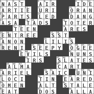 ACROSS 1. Political cartoonist Thomas 5. Wind 8. Binary compound 11. Nick name for Arthur 13. RI univ. 14. NW Algerian seaport 15. Pieces 16. Directed 17. Mild oath, euphamism for damn 18. White ___ sheet 19. Small amounts or degrees 21. Carrier 22. Adolescent 24. Ancient Greek god of war 25. Main course 27. Fast jet (abbr.) 29. At once, immediately (arch.) 30. Ms. Damita and namesakes 32. Painter Guido (1575-1642) 33. Oozy 35. Double curve, resembling the letter S 39. Vices 41. Religious women 42. Big collection agency 43. Chalkboards 45. _ mater 48. Draw slowly or heavily 49. Satellite of Uranus 50. Ketch in the Levant 52. Single; one (prefix) 55. Locales 56. Metal container 57. Having ears or earlike features 59. Presage 60. The first octave above the treble staff 61. Showing deterioration from age 62. Consume 63. Two (Sp.) 64. Silent film actress Nazimova DOWN 1. California wine valley 2. Caspian sea tributary 3. Ski resort town in Vermont 4. Teat (slang) 5. Old (Scot.) 6. Angers 7. To free from 8. Feeling or showing extreme anger 9. Natives or inhabitants of Denmark 10. Engineer (abbr.) 12. First name in cosmetics 14. Aroma 20. One (Scot) 21. Jacques of French films 23. Bert's buddy 25. Hearing organ 26. Compass dir. 27. Small drink 28. Cunning 30. French article 31. Echolocation 33. Title for a knight 34. Raised railways 36. From the throat 37. Compass dir. 38. Double-curved letter 40. Small bottle 43. _-fi 44. Shoestrings 45. Scent 46. It is permitted: Lat. 47. Chow _ 49. Medicinal plant 50. Grain storage tower 51. Pismires 53. 1994 drama film starring Jodie Foster 54. It may be bright or harebrained 56. Small amount or degree 58. _ moment's notice (2 wds.)