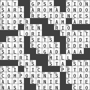 ACROSS 1. Keyboard modifier key 4. Global Positioning Systems (abbr.) 8. The Jewish people; Israel 12. Indian skirt 14. Odor 16. Southwest Nigerian state 17. Neighbor of Neb. 18. Homes 20. A person who is older than you are 22. Scottish cap 23. "We ___ not amused" (Victoria) 24. Born 25. Layer 28. _ de Janeiro 30. Australian parrot (variant) 31. Distinguishing feature 35. Compass dir. 37. Arranges properly for use 40. "You Light Up My Life" star Conn 41. Actor Alda or Thicke 42. Learning spot: Fr. 44. Genesis locale 45. Grain storage tower 46. Mild oath 47. American Automobile Association (abbr.) 48. _ dish (used to culture cells) 50. Place where flour is made 52. Followers of ems 54. R.R. building 55. Title for a knight 58. _-fi 61. Nervous spasm 63. Stone: prefix 65. Parts 70. Frog relative 71. High mountains 72. Bert's buddy 73. Quote 74. Political cartoonist Thomas 75. Adolescent 76. Corporate head (abbr.) DOWN 1. NE Netherlands city 2. Dipping utensil 3. Exchange 4. Slender fish 5. Before (prefix) 6. Distress signal 7. Stricken, poetically 8. Boy, to dad 9. South American Indian 10. Baltic tributary 11. Olfactory organ 13. Mamie's husband 15. The sixth month of the Jewish calendar 19. Give off 21. 17th letter of the Greek alphabet 26. Celtic language 27. Sibling's daughter 29. Severe or trying experience 30. Poe poem 32. Opera by Verdi 33. The main thing one is thinking about 34. Shallow baking pan 35. Writer Wiesel 36. Table seasoning 38. Coat; cloak 39. Criticizes harshly 41. Viper 43. Prepare for publication 49. To the inside or interior of 51. Infant locale 53. Trig term 55. Unemotional 56. Feeling or showing extreme anger 57. Cowboy competition 58. Skim 59. Root beer relative 60. Naughty children 62. Certainty 64. And so on (abbr.) 66. Pacific Standard Time (abbr.) 67. Compass dir. 68. Neckwear 69. Elected rep.