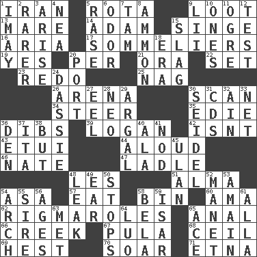ACROSS 1. SW Asia republic 5. Roll call or roster of names 9. Spoils 13. Female horse 14. First man 15. Scorch 16. Operatic vocal solo 17. Wine waiters 19. It is so 20. For each 21. Mouth or opening 22. Put into a specified state 23. Redecorate 25. Tired old horse 26. Sports stadium 30. Examine hastily 34. Guide 35. Singer Brickell 36. Claim 39. Utah city north of Ogden 42. Is not 43. Needle holder 44. Verbally 46. Nathan's nickname 47. Dipping utensil 48. French article 51. _ mater 54. White ___ sheet 57. Erode 58. Storage container 60. Wet nurse (var.) 62. Complicated, petty procedures 65. Of or related to the anus 66. Small stream 67. Monetary unit of Botswana 68. To provide with a ceiling 69. Behest 70. Fly high 71. Inactive volcano in Sicily DOWN 1. "If ____ say so..." 2. Less widely known 3. Ascend 4. Teachers' org. 5. Raze (variant) 6. Scent 7. Scottish cap 8. ID or VA city 9. Cards in a Roman deck? 10. Washington bills 11. Legendary monster 12. Trial 15. Volcanic refuse 18. Epoch 20. Left side of a ship or aircraft 24. Hyrax 27. Snakelike fish 28. Modern: prefix 29. Therefore, facetiously 30. A glass for beer 31. Music discs 32. The 18th letter of the Arabic alphabet 33. Fish or hair follower 36. Lair 37. Call ___ day 38. Yet 40. According to 41. Lower and raise head in agreement 45. Uhlan (variant) 48. Path through which fluid escapes 49. Hearing organ 50. Discontinues 52. French painter Edouard 53. With great haste 54. Bowlike part 55. Beget 56. Grows older 58. Actor Lugosi 59. Austrian river, tributary to the Danube 61. Silent film actress Nazimova 63. Was introduced to 64. Nilotic language 65. Adept person