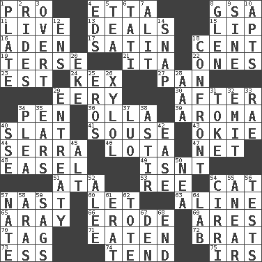 ACROSS 1. Adept person 4. Singer James 8. Girls' org. (abbr.) 11. Not recorded 13. Allots cards 15. Mouth edge 16. An important port of Yemen 17. Smooth fabric 18. Penny 19. Laconic 21. Call ___ day 22. Washington bills 23. Eastern Standard Time (abbr.) 24. A weed 27. Baking dish 29. Suggestive of the supernatural 30. Following 34. Animal enclosure 36. Water jar 39. Scent 40. Narrow board 41. Lush 43. Migrant worker of the '30s 44. Spanish missionary in California 46. Globular water bottle used in Asia 47. Fish or hair follower 48. Artist's stand 49. Is not 51. "One Day ___ Time" 53. Portuguese money of account (variant) 54. Domesticated feline 57. Political cartoonist Thomas 60. Allow 63. Place in a line 65. Like ___ of sunshine 66. Eat (away) 69. Ancient Greek god of war 70. Label 71. Ingested 72. Naughty child 73. Curvy letter 74. Look after 75. Big collection agency DOWN 1. Food holder 2. Amusement-park features 3. Unconcealed 4. Begley and Asner 5. Beverage made from leaves 6. Jacques of French films 7. Came down and settled, as after flight 8. Small, secluded valley 9. Trig term 10. Flats, for short 12. Followers of ems 14. Fastener 18. Meet 20. Make supply last 25. Greek god of love 26. Xylene (variant) 28. American Automobile Association (abbr.) 29. Plea 31. Puff or smoke 32. Give off 33. Actress Charlotte 34. Entreaty 35. Hearing organs 37. Nilotic language 38. Moving about 40. Compass dir. 42. Relaxation 45. The first octave above the treble staff 50. Teachers' org. 52. Toward shelter 54. High-altitude cloud 55. Approach 56. Trials 57. Nathan's nickname 58. Ancient river in northeast Turkey 59. Settles 61. Part of Q.E.F. 62. Carryall 64. Experiment locale 67. Lair 68. Conclude