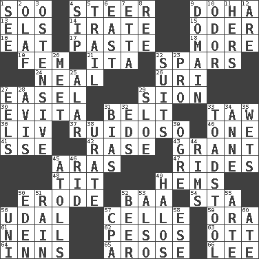 ACROSS 1. "Barney Miller" actor Jack 4. Guide 9. Capital of the state of Qatar 13. Raised railways 14. Feeling or showing extreme anger 15. Baltic tributary 16. Ingest 17. Thick mixture 18. Greater amount 19. Opposite of masc. 21. Call ___ day 22. Practice fights 24. Be tempered by heat 26. RI univ. 27. Artist's stand 29. The Jewish people; Israel 30. Webber/Rice musical 31. Waist strap 33. The 23rd letter of the Hebrew alphabet 36. 54 in ancient Rome 37. Boisterous (Brazilian Portuguese) 40. Single 41. Compass dir. 42. To erase 43. Let have 45. Ancient river in northeast Turkey 47. Amusement-park features 48. Teat (slang) 49. Equivocates 50. Wear away 52. Sound made by sheep 54. R.R. building 56. Allodial 57. Cell (Danish) 59. Mouth or opening 61. Famous astronaut Armstrong 62. Mexican monetary units 63. Baseball player Mel 64. Lodging establishments 65. Came up 66. Area sheltered from the wind DOWN 1. Perceive with the eye 2. Norwegian king 3. Clearly or manifestly demonstrative 4. Small drink 5. Get behind 6. Compass direction 7. Singer James 8. To sift 9. Kingdom 10. Scent 11. Possessive pronoun 12. "We ___ not amused" (Victoria) 20. Rendezvous 22. Sets of matching outer garments 23. Adept person 25. Having or resembling wings 27. Snakelike fish 28. Deliberation 29. _ gin 31. Prejudice 32. Begley and Asner 33. Inedible or poisonous agaric 34. Queen of England 1702-14 35. Moistens 38. A salt of uric acid 39. Legendary monster 44. Basketball hoops 45. Ringlike coral islands and reefs 46. To free from 49. Saint headwear 50. Locale of original sin 51. Precipitation 52. Fermented drink made from hops 53. In addition 55. Johnson of "Laugh-In" 56. Corn or form start 57. Accounting whiz (abbr.) 58. Compass dir. 60. Had dinner