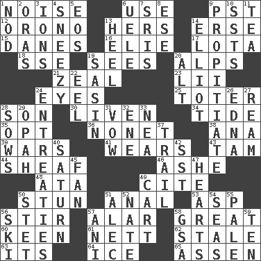 ACROSS 1. Annoying sound 6. Purpose 9. Pacific Standard Time (abbr.) 12. U. of Maine site 13. Possessive pronoun 14. Celtic language 15. Natives or inhabitants of Denmark 16. Writer Wiesel 17. Globular water bottle used in Asia 18. Compass dir. 19. Observes 20. High mountains 21. Ardor 23. Cards in a Roman deck? 24. Sight organs 25. Carrier 28. Male child 30. Make or become more lively 34. Event that recurs at intervals 35. Elect 36. Music written for nine 38. Santa ___, CA 39. Armed conflicts 41. Puts on (as clothing) 43. Scottish cap 44. Archer's quiver 46. American tennis player Robert 48. _ moment's notice (2 wds.) 49. Quote 50. Make senseless or dizzy 51. Of or related to the anus 53. Cleo's killer 56. Use a spoon 57. Having or resembling wings 58. Relatively large 60. Peachy ____! 61. Remaining after all deductions 62. Lacking originality or spontaneity 63. ___ a Wonderful Life 64. Frozen water 65. NE Netherlands city DOWN 1. Lower and raise head in agreement 2. Mouths or openings 3. Charged atoms 4. Dwarf with a sinus problem 5. Greek goddess of the dawn 6. Ubangi River tributary 7. Indian titles of respect 8. Compass dir. 9. Appease 10. Fast planes 11. Afternoon social gathering 13. Person who is morally reprehensible 14. American author Paul (1891-1958) 19. Indian antelope 20. The first octave above the treble staff 22. Snakelike fish 24. Pleas 26. Pulitzer Prize-winning author Ferber 27. 480, 500 or 516 sheets of paper 28. Sty mamas 29. Brightly colored fish 31. Promise 32. Compass dir. 33. Teachers' org. 37. Go after with the intent to catch 40. Titan orbits this 42. Fast jet (abbr.) 45. Avid follower 47. Centers of feelings and intuitions 49. Heavy open wagon 50. Proofreading order 51. Actor Baldwin 52. Nathan's nickname 54. Oceans 55. Diluted with white 56. What Jean-Claude Killy likes to do 57. Black tropical American cuckoo 58. Girls' org. (abbr.) 59. "___ Little Indians"