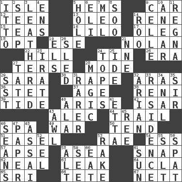 ACROSS 1. Small island 5. Equivocates 9. 4-wheeled motor vehicle 12. Adolescent 13. Margarine 14. French philosopher Descartes 15. Afternoon social gatherings 16. _ and Stitch 17. Cassini of fashion 18. Choose 19. Compass dir. 21. Pitcher Ryan 22. Land elevation 24. Metal container 26. Epoch 27. Laconic 28. Method 29. "Two Mules for Sister ____" 30. Window treatment 32. Ancient river in northeast Turkey 36. Proofreading order 37. Ripen 38. Painter Guido (1575-1642) 39. Event that recurs at intervals 40. Ascend 42. Austrian river, tributary to the Danube 43. Actor Baldwin 44. Drop behind 46. Health resort 49. Armed conflict 50. Watch over 51. Artist's stand 53. Actress Charlotte 54. Curvy letter 57. Domed church section 58. At sea 61. Fastener 62. Actress Patricia 63. Path through which fluid escapes 64. Southern CA. univ. 65. Indian title of respect (Mr.) 66. Wig 67. Remaining after all deductions DOWN 1. "Tell ____ the Marines!" 2. Ooze 3. Tough but pliablecoriaceous 4. Followers of ems 5. Opening into or through something 6. Biblical high priest 7. Cartoonist voice _ Blanc 8. "Barney Miller" actor Jack 9. Cell (Danish) 10. Approach 11. Rain (Swedish) 14. Friend of Pooh 19. Raised railways 20. Downhill vehicle 21. Compass dir. 23. Feeling or showing extreme anger 24. Drinks excessively 25. Binary compound 27. Jacques of French films 28. Mysterious quality of enchantment 29. Fast jet (abbr.) 31. More uncommon 32. Believer in; advocate of (suffix) 33. Dwelling 34. Of or related to the anus 35. Title for a knight 40. According to 41. Singer James 43. Leather borer 45. To riddle 46. Actors Connery and Penn 47. Some stationery 48. Slender Brazilian palm 52. Snakelike fish 53. Libertine 55. Table seasoning 56. Petty quarrel 58. Keyboard modifier key 59. Perceive with the eye 60. Ingest 61. Player for Phoenix