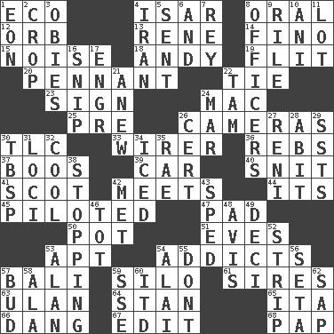ACROSS 1. Environmental prefix 4. Austrian river, tributary to the Danube 8. Of the mouth 12. Globe 13. French philosopher Descartes 14. Fine (Spanish) 15. Annoying sound 18. "60 Minutes" Commentator Rooney 19. Secret move to avoid paying debts 20. Pre-World Series prize 22. Standoff 23. Attach a signature 24. Apple computer (short form) 25. Before (prefix) 26. Devices for capturing images 30. Affectionate concern, for short 33. One who wires 36. Confederate soldiers (slang) 37. Expressions of contempt or scorn 39. Auto 40. In a ____ (agitated or irritated) 41. Native of Scotland 42. Confronts 44. ___ a Wonderful Life 45. Manned the helm 47. Groovy apt. 50. Plant holder 51. Nights before holidays 53. Fitting 54. Inveterate users 57. Indonesian resort city 59. Grain storage tower 61. Titles for men of rank and authority 63. ____ Bator 64. Comedian Laurel of Laurel & Hardy 65. Call ___ day 66. Mild oath, euphamism for damn 67. Prepare for publication 68. Infant food DOWN 1. Period of immesurable duration 2. Riding implement 3. Off-Broadway awards 4. SW Asia republic 5. Transmitted 6. Added to 7. Marina Del _, California 8. Persons of authority 9. Cause heat under the collar 10. Black tropical American cuckoo 11. Car dealer's back yard 16. Sever or remove by pinching or nipping 17. Engineer (abbr.) 21. Afresh 22. Scottish cap 24. Third mo. 26. Sure thing 27. Painter Guido (1575-1642) 28. "This won't hurt ____!" 29. Fast planes 30. Cook's measure (abbr.) 31. Event scenes 32. Calm and collected 34. On the rocks 35. Actress Charlotte 38. Constricting 42. Was introduced to 43. Hurried 46. Small child 48. Opinion 49. Tenth: prefix 52. Empty completely 53. Actor Alda or Thicke 54. Jai _ 55. Do not 56. Bristle 57. Partially opened flower 58. Chicken ___ king 59. Compass dir. 60. It would 62. Plant excrement