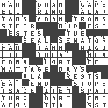 ACROSS 1. Armed conflict 4. NW Algerian seaport 8. Open wide 12. Biblical high priest 13. Tall New Zealand timber tree 14. Having or resembling wings 15. Small boys 17. First man 18. Removes the wrinkles 19. Navigate 21. Partially opened flower 23. Compass dir. 24. _____ Park, CO 26. Third day of the wk. 28. Lick closed 30. Legislator 34. Distant 37. Hyperbolic tangent 39. Swiss mountan, "Queen of the Mountains" 40. Whopper 41. Standard of perfection 43. Teachers' org. 44. Pulitzer Prize-winning author Ferber 46. Australian parrot (variant) 47. Snakelike fish 48. Electrical Measurement 51. 24-hour periods 54. Wing 55. Musical pauses 58. Ingest 61. Conclude 63. Discontinues 65. Sadhe (variant) 67. A whole individual unit 71. Petty quarrel 72. Through, poetically 73. Have the gumption 74. Compass dir. 75. A really long time 76. Slanted text style (abbr.) 77. Fast jet (abbr.) DOWN 1. Soaks 2. Having winglike extensions 3. Amusement-park features 4. Mouth or opening 5. To free from 6. Housemaid (var.) 7. Unfeeling 8. Slender fish 9. Medicinal plant 10. Zero-star reviews 11. Celtic language 16. Puts into a specified state 18. Goddess of spring and wife of Bragi 20. Portuguese money of account (variant) 22. Shoshoni 25. Suttee (variant) 27. Ewer handle 29. Dipping utensil 30. Pottery fragment 31. Prong on a fork 32. Double curve, resembling the letter S 33. Monetary unit of Yemen 34. Soared 35. Opera by Verdi 36. Monthly bill 38. Modern: prefix 42. One who doesn't tell the truth 45. "One Day ___ Time" 49. Toward shelter 50. Separate the seeds from cotton 52. Affirmative reply 53. Fast planes 56. Drinks excessively 57. Connects, as a bridge 58. Singer James 59. American tennis player Robert 60. Edible starchy tuberous root 62. "You Light Up My Life" star Conn 64. Proofreading order 66. Spanish title 68. Make lace 69. Epoch 70. Cartoonist voice _ Blanc