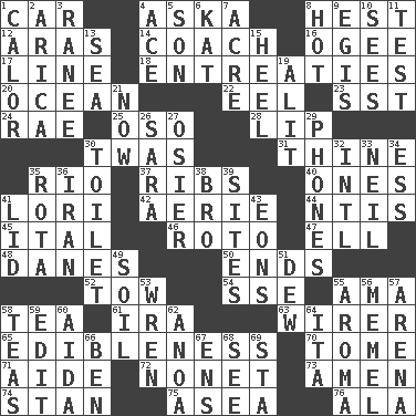 ACROSS 1. 4-wheeled motor vehicle 4. "____ silly question..." 8. Command 12. Ancient river in northeast Turkey 14. Team commander 16. Double curve, resembling the letter S 17. Actor's bit 18. Pleas 20. Sea 22. Snakelike fish 23. Fast jet (abbr.) 24. Actress Charlotte 25. Bear (Spanish) 28. Mouth edge 30. It was, poetically 31. One or ones belonging to thee 35. _ de Janeiro 37. Chest bones 40. Singles 41. Australian parrot (variant) 42. Nest on high 44. Nuclear Threat Initiatives 45. Slanted text style (abbr.) 46. Printing process, for short 47. Pipe bend 48. Natives or inhabitants of Denmark 50. Conclusions 52. Pull behind 54. Compass dir. 55. Wet nurse (var.) 58. Afternoon social gathering 61. Lyricist Gershwin 63. One who wires 65. The property of being fit to eat 70. Heavy book 71. Assistant 72. Music written for nine 73. So be it 74. Comedian Laurel of Laurel & Hardy 75. Toward the sea 76. Insect wing DOWN 1. Bodily heat indicating an inflammation 2. N. Chile seaport 3. The wife of a rajah (variant) 4. Adept person 5. Manchild 6. Krazy ___ of comics 7. 1/640 square mile 8. Being at a high temperature 9. The front part of a cuirass 10. Perceives with the eye 11. Trial 13. Ocean 15. The bottom of a shoe or boot 19. Set down 21. At this time 26. "Two Mules for Sister ____" 27. Flexible twig of a willow tree 29. Gives a jingle 30. Bathroom plumbing fixture 32. International (abbr.) 33. Famous astronaut Armstrong 34. Curvy letter 35. Round or rotation of duties 36. SW Asia republic 38. Sis' sibling 39. Locates 41. Flaplike covering 43. Immeasurably long periods of time 49. Earth 51. Morning condensation 53. Songbird 55. Odor 56. Klaipeda city 57. Sports stadium 58. Afternoon social gatherings 59. Prepare for publication 60. Opera by Verdi 62. Small Philippine buffalo 64. Call ___ day 66. Benjamin's nick name 67. Followers of ems 68. Perceive with the eye 69. R.R. building
