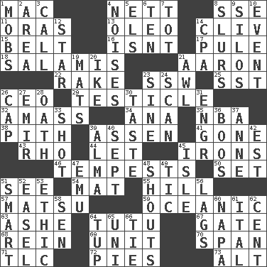 ACROSS 1. Apple computer (short form) 4. Remaining after all deductions 8. Compass dir. 11. Mouths or openings 13. Margarine 14. 154 in Roman numerals 15. Waist strap 16. Is not 17. Whine 18. Deli grouping 21. Composer Copland 22. Immoral or dissolute person 23. Compass dir. 25. Fast jet (abbr.) 26. Corporate head (abbr.) 29. One of the two male reproductive glands 32. Collect or gather 34. Santa ___, CA 35. Basketball assoc. 38. Essential or central part 39. NE Netherlands city 41. Went 43. 17th letter of the Greek alphabet 44. Allow 45. Metal shackles 46. Storms 50. Arrange properly for use 51. Observe 54. Floor protector 55. Land elevation 57. Taiwanese island in East China Sea 59. Pertaining to the sea 63. American tennis player Robert 64. Ballerina skirt 67. Yard entry 68. It's straight from the horse's mouth 69. A single undivided whole 70. Connect, as a bridge 71. Affectionate concern, for short 72. Sliced desserts 73. Keyboard modifier key DOWN 1. Crowds into 2. Length times width 3. Give a ring to 4. Annoying sounds 5. Raised railways 6. "___ Little Indians" 7. Small child 8. Disparaging remarks 9. Grain storage towers 10. Incident 12. Play the lead 14. Accounting whiz (abbr.) 19. Floor protectors 20. Mamie's husband 21. Leather borer 23. Trig term 24. Examine minutely or intensely 26. Head covering 27. Arab leader 28. Pledge 30. Clothes sense 31. Engineer (abbr.) 33. Went for two points 36. Expressions of contempt or scorn 37. Singer Murray 39. _ mater 40. Back-to-school mo. 42. Eastern Standard Time (abbr.) 45. Small island 47. Australian flightless bird 48. Yells 49. Nervous spasm 51. Don Adams' spy role 52. Artist's stand 53. Moral principle 56. Fails to keep up a pace 58. Elected rep. 60. California wine valley 61. Slanted text style (abbr.) 62. Penny 64. Uncastrated adult male sheep 65. University (slang) 66. Neckwear