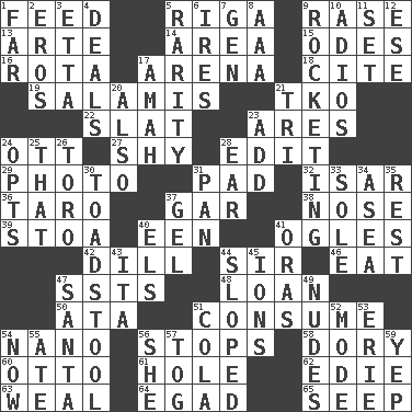 ACROSS 1. Nourish 5. Port city in Latvia 9. Raze (variant) 13. Johnson of "Laugh-In" 14. Length times width 15. Lyric poems 16. Round or rotation of duties 17. Sports stadium 18. Quote 19. Deli grouping 21. Ring climax 22. Narrow board 23. Ancient Greek god of war 24. Baseball player Mel 27. Like a shrinking violet 28. Prepare for publication 29. Picture 31. Groovy apt. 32. Austrian river, tributary to the Danube 36. Edible starchy tuberous root 37. Slender fish 38. Sense of smell 39. Portico 40. Car or cant ending 41. Stares 42. Deli pickle 44. Title for a knight 46. Consume 47. Fast planes 48. Grant temporary use of 50. _ moment's notice (2 wds.) 51. Ingest 54. Billionth: prefix 56. Ceases 58. Dinghy 60. Von Bismarck 61. Opening into or through something 62. Singer Brickell 63. Welt 64. Mild oath 65. Ooze DOWN 1. At a great distance 2. Greek god of love 3. Singer James 4. Allots cards 5. Noteworthy scarcity 6. Angers 7. Commissioned mil. rank 8. Auto club (abbr.) 9. Shooting up abruptly 10. Goodbye (Sp.) 11. Arrange properly for use 12. Compass dir. 17. Nursemaid 20. In addition 21. Three (prefix) 23. Find the sum of 24. Chooses 25. Not this but _ 26. "Corrida" creature 28. Ewer handle 30. Inedible or poisonous agaric 31. Baking dish 33. Not divided or shared with others 34. Toward the sea 35. State of inaction 37. Set 40. Raised railways 41. Mouths or openings 43. Call ___ day 44. Had an oblique or slanted direction 45. Charged atoms 47. Before Barbara or Clara 49. Unclothed pictures 51. Root beer relative 52. Method 53. 4th largest of the Great Lakes 54. At this time 55. Had dinner 56. A female animal or person 57. Coat; cloak 59. Slangy assent