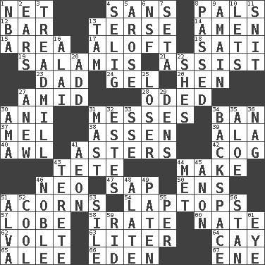 ACROSS 1. Fish or hair follower 4. Without 8. Friends 12. Tavern 13. Laconic 14. So be it 15. Type of rug 17. Upward 18. Suttee (variant) 19. Deli grouping 21. Aid 23. June honoree 24. Set 26. Layer 27. Among 28. Wrote a lyric poem 30. Cuckoo 31. Makes clutter 34. Prohibit 37. Cartoonist voice _ Blanc 38. NE Netherlands city 39. In the manner of 40. Leather borer 41. Michaelmas daisies 42. Gear tooth 43. False hair 44. Cause to be 46. Modern: prefix 47. Plant excrement 50. Followers of ems 51. Oak nuts 54. Portable computers 57. Ear part 58. Feeling or showing extreme anger 60. Nathan's nickname 62. Electrical Unit 63. 61 cubic inches 64. Island 65. Toward shelter 66. Paradise 67. Compass dir. DOWN 1. Basketball assoc. 2. Hearing organs 3. Excercise machine 4. Major League Baseball Commissioner Bud 5. Came up 6. Overdraft (abbr.) 7. Bristle 8. Went by 9. With great haste 10. Allows 11. In a ____ (agitated or irritated) 13. Scottish cap 16. Jai ____ 20. Increase 22. "______ My Girl" (Turtles hit) 25. Failure 27. Afresh 29. Hiding places for outlaws 30. Wet nurse (var.) 31. Vertical spar for supporting sails 32. _____ Park, CO 33. Compass dir. 34. Keyboard key 35. _ vera 36. Tired old horse 41. A really long time 43. Cylindrical with tapered ends 44. Was introduced to 45. Soon (poet.) 46. Having high moral qualities 48. Having winglike extensions 49. Eucharist need 51. Inventor's middle name 52. Calm and collected 53. Drop; flow; fall 55. For each 56. Comedian Laurel of Laurel & Hardy 59. To free from 61. Sight organ