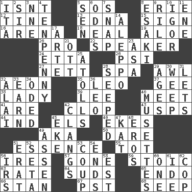 ACROSS 1. Is not 5. Distress signal 8. One of the Great Lakes 12. Prong on a fork 13. Pulitzer Prize-winning author Ferber 15. Public display of a written message 16. Sports stadium 18. Actress Patricia 19. _ vera 20. Adept person 22. Orator 24. Singer James 26. Air pressure measure (abbr.) 27. Remaining after all deductions 28. Health resort 29. Leather borer 32. Age 35. Butter sub 37. Turn to the right 38. Kenny Rogers chart-topper in '80 39. Area sheltered from the wind 40. Rendezvous 41. "We ___ not amused" (Victoria) 42. Hoof sound 43. United States Postal Service (abbr.) 44. Indiana (abbr.) 45. Raised railways 46. Supplements with great effort 49. Alias (abbr.) 50. Have the gumption 51. Substance 55. Small child 56. Angers 57. Went 59. Unemotional 63. Pace 64. Beer foam 65. Inside; within (prefix) 66. Comedian Laurel of Laurel & Hardy 67. Pacific Standard Time (abbr.) 68. Ooze DOWN 1. Call ___ day 2. Title for a knight 3. Compass dir. 4. 3-inch nail 5. Elected rep. 6. Lyric poems 7. Fastener 8. 1973 Nobel Price Winner (Physics) Leo 9. Cause heat under the collar 10. Composer Stravinsky 11. Compass dir. 14. City in Syria 17. Johnson of "Laugh-In" 21. Baseball player Mel 23. White ___ sheet 25. Ringlike coral islands and reefs 28. Oozed 29. Eras 30. Shed a tear 31. Allows 32. Mountain range southwest of Kyrgyzstan 33. Merit 34. Wrote a lyric poem 36. Lion 40. French bagpipes 42. Rings like a ship's bell 45. Make supply last 47. Krazy ___ of comics 48. Greek god of love 49. NE Netherlands city 51. Part of Q.E.F. 52. Bristle 53. Overturn; upset 54. Extremities 56. Big collection agency 58. Eastern Standard Time (abbr.) 60. Single 61. Binary compound 62. Police officer (slang)
