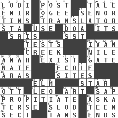 ACROSS 1. Farming town in central California 5. Mail 9. Lie 13. Arab leader 14. Double curve, resembling the letter S 15. Sir (Sp.) 16. Airtight sealed metal containers 17. Interpreter 19. R.R. building 20. Purpose 21. ___ good deed 22. ___ a Wonderful Life 23. Indian titles of respect 25. Fast jet (abbr.) 26. Trials 30. "Terrible" tsar 34. Small stream 35. Mediterranean tributary 36. Nanny 39. Be extant 42. Yard entry 43. Nathan's nickname 44. Learning spot: Fr. 46. Ancient river in northeast Turkey 47. Settings 48. Shade tree 51. Play the lead 54. Baseball player Mel 57. Lion 58. Tate display 60. Plant excrement 62. Conciliate 65. "____ silly question..." 66. Laconic 67. Oscar Madison type 68. Adolescent 69. Religious group 70. Scottish caps 71. Conclusions DOWN 1. Allows 2. Leaves out 3. Middle Eastern gold or silver currency 4. Big collection agency 5. Plant holders 6. Legendary monster 7. Ocean 8. Looks after 9. Afternoon social gathering 10. Against 11. Plunder 12. Blunders 15. Narrow board 18. Mayday 20. One who uses or employs something 24. Strong, restless desires 27. Perceive with the eye 28. John Ritter's dad 29. Atmospheres 30. Swallow 31. By way of 32. Keyboard modifier key 33. Born 36. Santa ___, CA 37. Make imperfect 38. _ moment's notice (2 wds.) 40. _-fi 41. Small child 45. For fear that 48. Writer Wiesel 49. Allow 50. Damp 52. NE Netherlands city 53. Moved through 54. Elects 55. Relationship diagram 56. Torque (variant) 58. Tiny particle 59. Confederate soldiers (slang) 61. Baking dishes 63. Pacific Standard Time (abbr.) 64. Insect wing 65. Had dinner