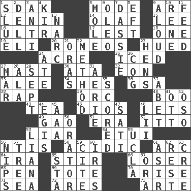 ACROSS 1. Neighbor of Neb. 5. Method 9. Sandy's bark 12. Soviet premier 1918-24 14. Norwegian king 15. Area sheltered from the wind 16. Extremist 17. For fear that 18. Single 19. Connecticut Ivy Leaguer 20. Lover boys 23. Became colored 24. 1/640 square mile 25. On the rocks 27. Vertical spar for supporting sails 30. "One Day ___ Time" 32. Age 33. Toward shelter 34. "______ My Girl" (Turtles hit) 36. Girls' org. (abbr.) 38. Hit sharply and swiftly 39. The grampus (Milton) 40. Sometimes accompanies a hiss 43. Afternoon social gathering 46. "Vaya con ____" 48. Allows 49. E Mali city 51. Epoch 52. "Tell ____ the Marines!" 53. One who doesn't tell the truth 54. Needle case 56. Nuclear Threat Initiatives 58. Being or containing an acid 61. Curve 64. Retirement account (abbr.) 65. Use a spoon 66. Failure 68. Fenced enclosure 69. Carry 70. Originate 71. Ocean 72. Ancient Greek god of war 73. Johnson of "Laugh-In" DOWN 1. Turn sharply 2. Small valley 3. Against 4. Apertif with cassis 5. Undercover agent 6. Butter sub 7. Small ungulate mammals of Africa 8. Bank Draft (abbr.) 9. Verbally 10. French philosopher Descartes 11. Nourish 13. Drug cop 21. Mouths or openings 22. Mode 23. Coop moms 24. Had dinner 26. Gear tooth 27. Third mo. 28. According to 29. Back-to-school mo. 31. Nest on high 35. Tallied 37. Collude with 41. Baseball player Mel 42. Bear (Spanish) 44. Armor plate that protects the chest 45. American Automobile Association (abbr.) 47. Suttee (variant) 48. Cards in a Roman deck? 50. Speaker 53. Climbing, woody, usually tropical vines 55. Southern CA. univ. 56. Pinches, bites 57. Woody plant 59. Quote 60. Angers 61. SW Saudi Arabia district 62. State of inaction 63. Algonquian 65. R.R. building 67. Mouth or opening
