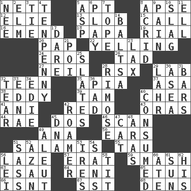 ACROSS 1. Remaining after all deductions 5. Fitting 8. Domed church section 12. Writer Wiesel 13. Oscar Madison type 15. Give a ring to 16. Make improvements or corrections to 18. Dad 19. Monetary unit of Yemen 20. Infant food 22. Crying or shouting loudly 24. Greek god of love 26. Small amount or degree 27. Famous astronaut Armstrong 28. Acura sports coupe 29. Experiment locale 32. Adolescent 35. Capital of Western Samoa 37. White ___ sheet 38. Whirlpool 39. Scottish cap 40. "Mermaids" star 41. Black tropical American cuckoo 42. Do over again 43. Mouths or openings 44. Actress Charlotte 45. Two (Sp.) 46. Examine minutely or intensely 49. Santa ___, CA 50. Hearing organs 51. Deli grouping 55. The 19th letter of the Greek alphabet 56. Goldbrick 57. Part of Q.E.F. 59. Box-office sellout 63. Son of Isaac 64. Painter Guido (1575-1642) 65. Needle case 66. Is not 67. Fast jet (abbr.) 68. Lairs DOWN 1. Born 2. Shade tree 3. Neckwear 4. 3-inch nail 5. Cleo's killer 6. Frolic 7. Drink excessively 8. Bitter 9. Ache 10. Volcanic refuse 11. Pipe bend 14. Greek mezzo-soprano Agnes 17. Have the gumption 21. Luau course 23. Not strict 25. Chalkboards 28. Full of chinks, cracks, or crevices 29. Cowardly lion portrayer 30. At sea 31. Oblong pieces of solid material 32. Pull into pieces 33. Pulitzer Prize-winning author Ferber 34. Singer Brickell 36. Groovy apt. 40. Eaten 42. Nomad 45. Heredity factor (abbr.) 47. Domesticated feline 48. Caspian sea tributary 49. Eskimo relative 51. Backtalk 52. Muslim summons to prayer 53. Angers 54. Without 56. Flowery wreath 58. Teat (slang) 60. Had dinner 61. Player for Phoenix 62. Part of HMS, perhaps