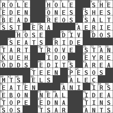 ACROSS 1. Hero or heavy, e.g. 5. Opening into or through something 9. A female animal or person 12. Paradise 13. Singles 14. "______ My Girl" (Turtles hit) 15. Necklace unit 16. Vintage cars 17. Table seasoning 18. Fast jet (abbr.) 19. Epoch 21. Nest on high 22. Flexible conduit 24. HTML Container Element 26. Two (Sp.) 27. Theater features 28. Travel on or in a vehicle 29. Small pie 30. Collection of objects 32. Comedian Laurel of Laurel & Hardy 36. Malaysian steamed pastry 37. Wedding promise 38. Jane of fiction 39. Probability 40. Proofreads 42. Type of rug 43. Adolescent 44. Mexican monetary units 46. Mountains (abbr.) 49. Raised railways 50. Actor Baldwin 51. Ingested 53. Black tropical American cuckoo 54. Big collection agency 57. Inky black, to poets 58. Be tempered by heat 61. It may be bright or harebrained 62. Drink excessively 63. Pulitzer Prize-winning author Ferber 64. Metal containers 65. Distress signal 66. Russian ruler of old 67. Pismires DOWN 1. Confederate soldiers (slang) 2. Lyric poems 3. Resembling or made to resemble leather 4. Conclusion 5. Israeli folk dance 6. Single 7. Lion 8. Double-curved letter 9. Broken piece 10. Sun: prefix 11. _____ Park, CO 14. Compass dir. 19. Eastern Standard Time (abbr.) 20. State of inaction 21. "___ Maria" 23. Profane or obscene expressions 24. A piece of turf (Scot.) 25. Binary compound 27. Saudi Arabian king (1953-1964) 28. "The Thinker" sculptor 29. Ring climax 31. Amusement-park features 32. Gospel singer Marvin 33. Polypeptide antibiotic 34. Ancient Greek god of war 35. Teachers' org. 40. Snakelike fish 41. Connect, as a bridge 43. "___ Little Indians" 45. Biblical high priest 46. Confronts 47. Off limits 48. Closes up, plugs up 52. Compass dir. 53. Having or resembling wings 55. Monthly bill 56. Backtalk 58. Fish or hair follower 59. Begley and Asner 60. Santa ___, CA 61. Call ___ day