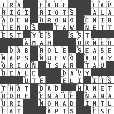 ACROSS 1. Lyricist Gershwin 4. Conductor's collection 8. Infant locale 11. Swiss mountan, "Queen of the Mountains" 13. Disturbances 15. Wing 16. An important port of Yemen 17. U. of Maine site 18. Independent ruler or chieftain 19. Is inclined (to) 21. The 23rd letter of the Hebrew alphabet 22. Remaining after all deductions 23. Eastern Standard Time (abbr.) 24. Consenting reply 27. Fast jet (abbr.) 29. Wet nurse 30. Abalone 34. Small moist lump or mass 36. Hero or heavy, e.g. 39. Gospel singer Marvin 40. Atlas contents 41. New (sp.) 43. Like ___ of sunshine 44. Greek mythologigal hunter 46. Russian ruler of old 47. The 19th letter of the Greek alphabet 48. Calif. Air Force Base 49. American folk hero Crockett 51. Shoshoni 53. Biblical high priest 54. ___ a Wonderful Life 57. Not this but _ 60. June honoree 63. French painter Edouard 65. Loose flowing garment 66. Related on the mother's side 69. Nanny 70. RI univ. 71. Roamer 72. International (abbr.) 73. Consume 74. Tenement units (abbr.) 75. Compass dir. DOWN 1. Feeling or showing extreme anger 2. Amusement-park features 3. Rep 4. Back 5. Atmosphere 6. Carrot, for example 7. Inactive volcano in Sicily 8. Unable to walk 9. Set down 10. Role in a play 12. Indiana (abbr.) 14. Sty mamas 18. Plea 20. Symbol (abbr.) 25. Merit 26. Yell 28. Distress signal 29. Utter; complete 31. Hindu Mythology: god of death 32. He sold his birthright 33. Marina Del _, California 34. Have the gumption 35. Capital of Western Samoa 37. French article 38. Elude 40. Crowd into 42. Of the mouth 45. Fish or hair follower 50. Zeal 52. Genesis locale 54. Lacking in sense or substance 55. Portable shelters 56. Having lost freshness 57. Loyal 58. Israeli folk dance 59. "This won't hurt ____!" 61. Small Philippine buffalo 62. Moist 64. Cuckoo 67. Make lace 68. Begley and Asner