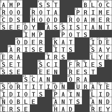 ACROSS 1. Electrical Unit 4. Fast jet (abbr.) 7. Group of countries in special alliance 11. Friend of Pooh 12. Roll call or roster of names 13. First class 14. Music discs 15. Parka part 16. Wanderer 17. Sleazy 19. Helper 21. Naughty child 23. Cooking vessels 24. River in Europe 25. Krazy ___ of comics 26. Binary compound 29. Originate 30. ___ a Wonderful Life 31. Declare 32. Epoch 33. Big collection agency 34. Sodium hydroxide 35. Arrange properly for use 36. _-fi 37. Strips of potato fried in deep fat 40. Compass dir. 41. Car or cant ending 42. Respite 43. Examine minutely or intensely 45. Mouth or opening 46. Determination 51. A salt of uric acid 55. Foolish or stupid persons 56. Ache 58. Hat (slang) 59. Impressive in appearance 60. Pismires 61. Also 62. Celtic language 63. Possessed 64. Marina Del _, California DOWN 1. Arches 2. Method 3. Introduce or present, as a question 4. "Barney Miller" actor Jack 5. Portico 6. Small boys 7. Naughty children 8. Pale green bean 9. Sign of things to come 10. Foregone conclusion 12. Poems 13. Mail 16. Disturbances 18. "You Light Up My Life" star Conn 20. Arguments over trivial matters 22. Before (prefix) 24. Declaim 25. Japanese brewing company 26. Small island 27. 24-hour periods 28. Sight organ 29. Ancient Greek god of war 32. Double-curved letter 33. Ancient Celtic tribe of eastern Britain 36. Theater features 37. From 38. Summer TV shows 39. Austrian river, tributary to the Danube 43. Fur scarf 44. Quote 46. Trig term 47. Scent 48. Teases 49. Brightly colored fish 50. Grandmother 52. Having or resembling wings 53. Prong on a fork 54. Whirlpool 57. It would