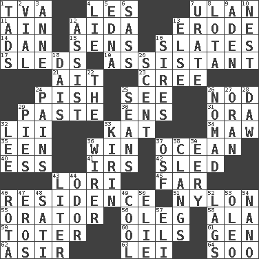 ACROSS 1. Federal power corp. 4. French article 7. Uhlan (variant) 11. The 18th letter of the Arabic alphabet 12. Opera by Verdi 13. Wear away 14. One of the 12 tribes of Israel 15. Elected reps. 16. Chalkboards 17. Bobsleighs 19. Aide 21. Small island 23. Algonquian 24. Expression of disdain 25. Observe 26. Dreamland 29. Thick mixture 30. Followers of ems 31. Mouth or opening 32. Cards in a Roman deck? 33. Krazy ___ of comics 34. Informal term for the mouth 35. Car or cant ending 36. Victory 37. Sea 40. Curvy letter 41. Big collection agency 42. Downhill vehicle 43. Australian parrot (variant) 45. Distant 46. Home 51. High-strength synthetic material 55. Speaker 56. Cassini of fashion 58. Wing 59. Carrier 60. Petroleums 61. Commissioned military rank (abbr.) 62. SW Saudi Arabia district 63. Luau accessory 64. "Barney Miller" actor Jack DOWN 1. Small boys 2. Small bottle 3. Singer Murray 4. Untruth 5. Pulitzer Prize-winning author Ferber 6. Backtalk 7. A salt of uric acid 8. Globular water bottle used in Asia 9. An important port of Yemen 10. A home for chicks 12. Aid 13. Otherwise 16. Begets 18. Raised platform 20. Odor 22. Definite Article 24. Aches 25. Seines 26. Wanderer 27. Northwest Algerian city 28. Simpleton 29. Sliced desserts 32. Area sheltered from the wind 33. Japanese brewing company 36. One who wires 37. Order of Saint Francis (abbr.) 38. Rings like a ship's bell 39. Suggestive of the supernatural 43. 61 cubic inches 44. Scent 46. Roll call or roster of names 47. Greek god of love 48. Suttee (variant) 49. Calm and collected 50. Writer Wiesel 52. Falls behind 53. Margarine 54. Billionth: prefix 57. Connecticut Ivy Leaguer