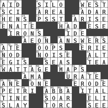 ACROSS 1. Assist 4. Grain storage tower 8. Compass direction 12. _-fi 13. Type of rug 14. The sixth month of the Jewish calendar 15. Coop moms 17. Inconspicuous attention getter 18. Originate 19. Related on the mother's side 21. Possessed 23. Compass dir. 24. Metal shackles 26. Binary compound 28. Age 30. Replies (to) 34. Had dinner 37. I made a mistake 39. 4th largest of the Great Lakes 40. Dreamland 41. Annoying sound 43. The first octave above the treble staff 44. Armor plate that protects the chest 46. Oceans 47. Beverage made from leaves 48. Electrical Measurement 51. Atlas contents 54. Nanny (var.) 55. A salt of uric acid 58. A saturated hydrocarbon 61. Single 63. Wear away 65. _ dish (used to culture cells) 67. Swedish rock group 71. Slanted text style (abbr.) 72. Prong on a fork 73. Fly high 74. Connecticut Ivy Leaguer 75. Kill 76. Torque (variant) 77. Perceive with the eye DOWN 1. American tennis player Robert 2. Ancient Celtic tribe of eastern Britain 3. Middle Eastern gold or silver currency 4. Plant excrement 5. Big collection agency 6. French article 7. Pledge 8. Armed conflict 9. Singer Brickell 10. Backtalk 11. Family _ (genealogy) 16. Portico 18. Sums up 20. Compass dir. 22. The 18th letter of the Arabic alphabet 25. Within a short period 27. She-sheep 29. Trap for birds or small mammals 30. Indian state 31. Part of Q.E.F. 32. Cause heat under the collar 33. Stalk of a moss capsule 34. Afresh 35. Ancient Roman robe 36. Prepare for publication 38. Sliced dessert 42. He sold his birthright 45. R.R. building 49. Mine, in Marseilles 50. Separate the seeds from cotton 52. Before (prefix) 53. Indian skirt 56. Lugs 57. Peak District village in England 58. Flats, for short 59. Famous astronaut Armstrong 60. Inactive volcano in Sicily 62. 90 degrees 64. Writer Wiesel 66. Marina Del _, California 68. Sometimes accompanies a hiss 69. Oblong piece of solid material 70. Curve