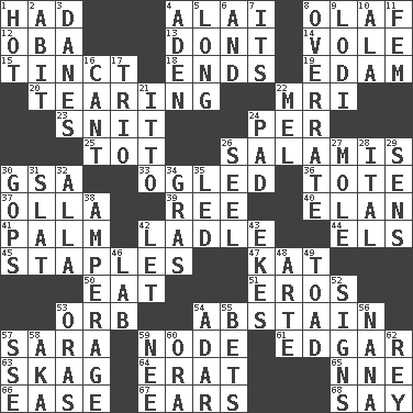 ACROSS 1. Possessed 4. Mountain range southwest of Kyrgyzstan 8. Norwegian king 12. Chief or king in Benin or Nigeria 13. Do not 14. Grand slam 15. A color or tint 18. Extremities 19. Dutch treat 20. Pulling into pieces 22. Medical imaging device (abbr.) 23. In a ____ (agitated or irritated) 24. For each 25. Small child 26. Deli grouping 30. Girls' org. (abbr.) 33. Stared at amorously 36. Carry 37. Rounded earthenware pot or jar 39. To separate or throw off 40. Liveliness 41. Inside of hand 42. Dipping utensil 44. Raised railways 45. Paper fasteners 47. Krazy ___ of comics 50. Consume 51. Greek god of love 53. Globe 54. Refrain by choice 57. "Two Mules for Sister ____" 59. Thickened enlargement 61. _ Allan Poe 63. Heroin 64. Part of Q.E.F. 65. Compass dir. 66. Comfort 67. Hearing organs 68. Declare DOWN 1. Being at a high temperature 2. "This won't hurt ____!" 3. Natives or inhabitants of Denmark 4. Arabian gulf 5. Having great length 6. Added to 7. ___ a Wonderful Life 8. Make much ado about nothing 9. Farming town in central California 10. In the manner of 11. Opposite of masc. 16. Patter 17. Musical group of three 21. "Tell ____ the Marines!" 22. Cartoonist voice _ Blanc 24. Writing tablet 26. Stitch closed the eyes of (a falcon) 27. Undercover agent 28. Slanted text style (abbr.) 29. Elected reps. 30. Republicans 31. Narrow board 32. Silent film actress Nazimova 34. Pate de foie ____ 35. Directed 38. Electrical Measurement 42. Allow 43. Supplements with great effort 46. Experiment locale 48. Johnson of "Laugh-In" 49. Frog relative 52. Public displays of written messages 53. Mouths or openings 54. The sixth month of the Jewish calendar 55. Wagers 56. Grandmother 57. Compass dir. 58. Alias (abbr.) 59. Born 60. Mouth or opening 62. Marina Del _, California