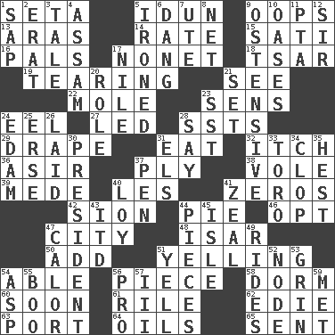 ACROSS 1. Bristle 5. Goddess of spring and wife of Bragi 9. I made a mistake 13. Ancient river in northeast Turkey 14. Pace 15. Suttee (variant) 16. Friends 17. Music written for nine 18. Russian ruler of old 19. Lacerating 21. Observe 22. Undercover agent 23. Elected reps. 24. Snakelike fish 27. Directed 28. Fast planes 29. Window treatment 31. Ingest 32. Hankering 36. SW Saudi Arabia district 37. Travel a route regularly 38. Short-tailed, large-bodied rat 39. Ancient Persian 40. French article 41. Nothings 42. The Jewish people; Israel 44. Sliced dessert 46. Choose 47. Municipality 48. Austrian river, tributary to the Danube 50. Increase 51. Crying or shouting loudly 54. Competent 56. Component 58. Dormintory (informal) 60. Within a short period 61. Cause heat under the collar 62. Singer Brickell 63. Left side of a ship or aircraft 64. Lubricates 65. Emitted DOWN 1. Plant excrement 2. Part of Q.E.F. 3. Lie 4. Indian state 5. Pressed 6. Mild oath, euphamism for damn 7. Shoshoni 8. Fish or hair follower 9. Clearly or manifestly demonstrative 10. Fertile tracts in a desert 11. Parent Teacher Association (abbr.) 12. Title for a knight 17. The longest river in the world 20. Hero or heavy, e.g. 21. Put into a specified state 23. Fast jet (abbr.) 24. Dutch treat 25. Celtic language 26. Put down 28. Declare 30. Elected leader of a country 31. Raised railways 33. "Corrida" creature 34. Hoof sound 35. Command 37. Writing instrument 40. Myrna of the movies 41. Ardor 43. It would 44. Parts 45. Small island 47. Bodily heat indicating an inflammation 49. Amusement-park features 51. Shout 52. Connecting point 53. Amused look 54. Cleo's killer 55. Surprise greeting 56. Adept person 57. One more than two 59. Was introduced to