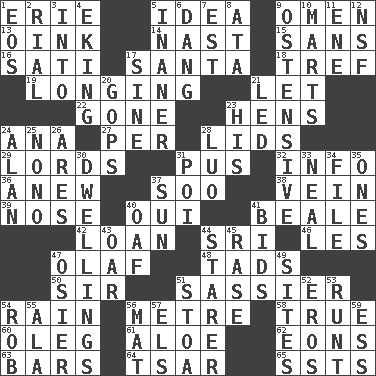 ACROSS 1. One of the Great Lakes 5. The main thing one is thinking about 9. Sign of things to come 13. Pig sound 14. Political cartoonist Thomas 15. Without 16. Suttee (variant) 17. Before Barbara or Clara 18. Unclean, religiously 19. Yearning 21. Allow 22. Went 23. Coop moms 24. Santa ___, CA 27. For each 28. Hats (slang) 29. Domineers 31. Festering 32. Information 36. Afresh 37. "Barney Miller" actor Jack 38. Distinctive style or manner 39. Olfactory organ 40. Fr. "Yes" 41. Calif. Air Force Base 42. Grant temporary use of 44. Indian title of respect (Mr.) 46. French article 47. Norwegian king 48. Bits 50. Title for a knight 51. More disrespectful 54. Water falling in drops from the sky 56. Distance measurement (Brit.) 58. Loyal 60. Cassini of fashion 61. Medicinal plant 62. Immeasurably long periods of time 63. Oblong pieces of solid material 64. Russian ruler of old 65. Fast planes DOWN 1. Greek goddess of the dawn 2. Monetary unit of Yemen 3. To the inside or interior of 4. Supplementing with great effort 5. Sillier 6. Mild oath, euphamism for damn 7. Eastern Standard Time (abbr.) 8. _ moment's notice (2 wds.) 9. Clearly or manifestly demonstrative 10. Shops 11. Compass dir. 12. Overdraft (abbr.) 17. Trig term 20. Republicans 21. Directed 23. Part of HMS, perhaps 24. Actor Alda or Thicke 25. Words to Nanette 26. Ancient Greek god of war 28. Nilotic language 30. Homes 31. Luau course 33. Be tempered by heat 34. Do some clerical work 35. Washington bills 37. Player for Phoenix 40. Clumsy lout 41. Auction offers 43. Rowing implement 44. A viewer who gazes fixedly 45. Raze (variant) 47. Flexible twig of a willow tree 49. Locates 51. Portico 52. Greek god of love 53. The smallest animal of a litter 54. Director Reiner 55. According to 56. Floor covering 57. Raised railways 59. Double-curved letter