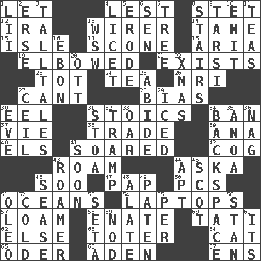 ACROSS 1. Allow 4. For fear that 8. Proofreading order 12. Lyricist Gershwin 13. One who wires 14. Not wild 15. Capri or Wright 17. Biscuitlike quick bread 18. Operatic vocal solo 19. Shoved, as through a crowd 21. Is extant 23. Small child 24. Beverage made from leaves 26. Medical imaging device (abbr.) 27. Patter 28. Prejudice 30. Snakelike fish 31. Unemotional ones 34. Prohibit 37. Compete 38. Buy and sell 39. Santa ___, CA 40. Raised railways 41. Flew 42. Gear tooth 43. Wander aimlessly 44. "____ silly question..." 46. "Barney Miller" actor Jack 47. Infant food 50. Personal Computers (abbr.) 51. Seas 54. Portable computers 57. Rich soil 58. Related on the mother's side 60. Jacques of French films 62. Otherwise 63. Carrier 64. Feline 65. River in Europe 66. Arabian gulf 67. Followers of ems DOWN 1. Cards in a Roman deck? 2. Celtic language 3. Baron Munchausen's specialties 4. It is permitted: Lat. 5. Wear away 6. Elected rep. 7. Woody plant 8. Flight of steps 9. Tarsus (plural) 10. Send forth 11. Afternoon social gatherings 13. Compass dir. 16. Inky black, to poets 20. Baseball player Mel 22. Dec. holiday 25. Tolerate 27. To provide with a ceiling 29. On the rocks 30. Night before a holiday 31. Portico 32. _____ steamer (cargo ship) 33. Rowing implement 34. Keyboard key 35. Small Philippine buffalo 36. Tired old horse 41. Within a short period 43. Wanderer 44. Fitting 45. Native of Scotland 46. Gospel singer Marvin 48. Having winglike extensions 49. Eucharist need 51. Butter sub 52. Having a low temperature 53. Bristle 55. For each 56. Comedian Laurel of Laurel & Hardy 59. Allow head to fall sleepily 61. ___ a Wonderful Life