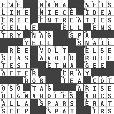 ACROSS 1. She-sheep 4. Nanny 8. Arranges properly for use 12. Welles in "The Third Man" 14. Sibling's daughter 16. The content of cognition 17. 4th largest of the Great Lakes 18. Pleas 20. Cell (Danish) 22. Pipe bend 23. Followers of ems 24. Attempt to accomplish something 25. Tired old horse 28. Health resort 30. Shout 31. Slow-paced one 35. To separate or throw off 37. Electrical Unit 40. Otherwise 41. Oceans 42. Stay clear from 44. Hero or heavy, e.g. 45. Trial 46. Inactive volcano in Sicily 47. Turn to the right 48. Following 50. Supercomputer manufacturer 52. Director Reiner 54. Afternoon social gathering 55. Small bed 58. Bear (Spanish) 61. Label 63. Ascend 65. Frustrating wastes of time 70. Arches 71. Silent film actress Nazimova 72. Practice fights 73. Part of Q.E.F. 74. Ooze 75. Argument over a trivial matter 76. Big collection agency DOWN 1. Opt 2. One who wires 3. Poet Dickinson 4. Compass dir. 5. The 18th letter of the Arabic alphabet 6. Fish or hair follower 7. Land measure 8. Be seated 9. Singer Brickell 10. Adolescent 11. Backtalk 13. Snakelike fish 15. Snakelike fish 19. High mountains 21. Compass dir. 26. Inventor's middle name 27. Michael Jackson trademark 29. Disorder of the immune system 30. Last past 32. Medicinal plant 33. Small island 34. Area sheltered from the wind 35. Coral ridge 36. Compass direction 38. Car dealer's back yard 39. Colored lightly or faintly 41. R.R. building 43. Have the gumption 49. Round or rotation of duties 51. Auto club (abbr.) 53. Taverns 55. High-altitude cloud 56. Witty Wilde 57. Trials 58. Mouths or openings 59. Drop; flow; fall 60. Stare 62. Republicans 64. Actress Charlotte 66. Atlas unit 67. Pet locale 68. Period 69. Fast jet (abbr.)