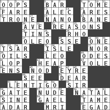 ACROSS 1. I made a mistake 5. Soap unit 8. Heavy book 12. Conductor's collection 13. Actor Baldwin 15. Ancient Greek god of war 16. Heavy duty weighing machine 18. Billionth: prefix 19. Object of repulsion 20. "___ Maria" 22. Thinks logically 24. Airtight sealed metal containers 26. 17th letter of the Greek alphabet 27. Butter sub 28. Compass dir. 29. Single 32. Russian ruler of old 35. Capri or Wright 37. Not either 38. Petroleums 39. Lion 40. Lyric poems 41. Chop off 42. Pile 43. Short-tailed, large-bodied rat 44. Followers of ems 45. Allow head to fall sleepily 46. Jane of fiction 49. Observe 50. Letter starter 51. Small, flat, pigmented spot on the skin 55. Title for a knight 56. Yard entry 57. Unadorned 59. Brizilian seaport 63. Trig term 64. Highlander 65. Docile 66. The sixth month of the Jewish calendar 67. Medical imaging device (abbr.) 68. Mild oath DOWN 1. Often (poetically) 2. Boat paddle 3. Adept person 4. Elected representatives 5. Forbid 6. Having or resembling wings 7. French philosopher Descartes 8. Off limits 9. Northwest Algerian city 10. Not women's 11. Compass dir. 14. Rough 17. Morally bad or wrong 21. Compass dir. 23. A female animal or person 25. Dirtied 28. Inclined 29. Southwest Nigerian state 30. Christmas carol 31. Celtic language 32. Lacquered or enameled metalware 33. The Jewish people; Israel 34. High mountains 36. Ocean 40. Make much ado about nothing 42. Cultivating 45. Fish or hair follower 47. Consenting reply 48. Water falling in drops from the sky 49. Scornful expression 51. Put down 52. Inactive volcano in Sicily 53. Island territory of the United States 54. Baltic tributary 56. Girls' org. (abbr.) 58. Connecticut Ivy Leaguer 60. Label 61. Nanny (var.) 62. Directed