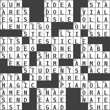 ACROSS 1. Chewing product 4. It may be bright or harebrained 8. R.R. building 11. Ancient Greek god of war 13. Stupid person 14. Small bottle 15. The front part of a cuirass 16. Small island 17. Rounded earthenware pot or jar 18. Small, flat, pigmented spot on the skin 21. A small or young owl 22. Proofreading order 23. Cards in a Roman deck? 25. Compass dir. 26. It is 29. A testis 32. Cowboy competition 34. Single 35. Apply (a substance) by light strokes 38. Kill 39. Tear up 41. Silent film actress Nazimova 43. Make supply last 44. Direct toward a target or goal 45. ID or VA city 46. SAT takers 50. Adept person 51. _ moment's notice (2 wds.) 54. Binary compound 55. Length times width 57. Mysterious quality of enchantment 59. Player piano 63. So be it 64. Fastener 67. Of the mouth 68. Post 69. Comfort 70. Nathan's nickname 71. Fast jet (abbr.) 72. Mild oath 73. A female animal or person DOWN 1. Highlander 2. Goad 3. Count _ (2 wds.) 4. Foolish or stupid persons 5. Two (Sp.) 6. Pipe bend 7. Had dinner 8. Beverly of Met fame 9. Lies 10. Having winglike extensions 12. Fast planes 14. Solemn pledge 19. "Tell ____ the Marines!" 20. Unit of force equal to gravity 21. Lubricate 23. Actor's bit 24. On the rocks 26. Big collection agency 27. Lacquered or enameled metalware 28. Neighbor of Neb. 30. Singer Mel 31. Dutch treat 33. Sight organs 36. _ mater 37. Alliance 39. Saudi Arabian king (1953-1964) 40. Flintstone garb 42. A saturated hydrocarbon 45. Toward the sea 47. Nervous spasm 48. Slept 49. Three (prefix) 51. Collect or gather 52. Domesticates 53. Rep 56. Soon (poet.) 58. Indiana (abbr.) 60. Mouths or openings 61. Thin strip of wood or metal 62. Toward shelter 64. Perceive with the eye 65. Tired old horse 66. White ___ sheet