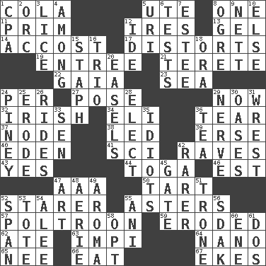 ACROSS 1. Root beer relative 5. Shoshoni 8. Single 11. Demure 12. Angers 13. Set 14. Buttonhole 17. What propaganda does 19. Main course 21. Cigar-shaped 22. Greek goddess of the earth (variant) 23. Ocean 24. For each 27. Airs 29. Immediately 32. From or relating to Ireland 34. Biblical high priest 36. Pull apart 37. Connecting point 38. Directed 39. Celtic language 40. Locale of original sin 41. _-fi 42. All-night dance parties 43. It is so 44. Ancient Roman robe 46. Eastern Standard Time (abbr.) 47. American Automobile Association (abbr.) 50. Small pie 52. A viewer who gazes fixedly 55. Michaelmas daisies 57. Characterized by complete cowardliness 59. Eaten away 62. Had dinner 63. Body of Kaffir warriors 64. Billionth: prefix 65. Born 66. Ingest 67. Makes supply last DOWN 1. Accounting whiz (abbr.) 2. The grampus (Milton) 3. Louse (plural) 4. Amid 5. RI univ. 6. Trials 7. First name in cosmetics 8. Legendary monster 9. Remaining after all deductions 10. Otherwise 12. Binary compound 15. Staphylococcus 16. Musical group of three 18. Mouth or opening 20. Artist's stands 24. Abounding in pines 25. Wear away 26. Amusement-park features 28. Choose 29. Impudent aggressiveness 30. Fertile tracts in a desert 31. Take or capture by force 33. Elected rep. 35. Foolish or stupid persons 36. Afternoon social gathering 42. More valued for its uncommonness 45. Yard entry 47. Tate display 48. Nest on high 49. Scent 51. Heavy duty weighing machine 52. Connect, as a bridge 53. Haul 54. Toward shelter 55. Black tropical American cuckoo 56. Neighbor of Neb. 58. Choose 60. Compass dir. 61. Two (Sp.)