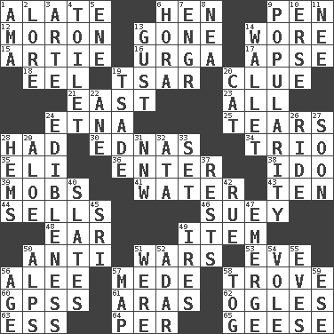 ACROSS 1. Having winglike extensions 6. Layer 9. Fenced enclosure 12. Person of subnormal intelligence 13. Went 14. Had on 15. Nick name for Arthur 16. Capital and largest city of Mongolia 17. Domed church section 18. Snakelike fish 19. Russian ruler of old 20. A slight indication 21. 90 degrees 23. 100% 24. Inactive volcano in Sicily 25. Pulls into pieces 28. Possessed 30. Ferber et al. 34. Musical group of three 35. Connecticut Ivy Leaguer 36. Keyboard key 38. Wedding promise 39. Crowds into 41. Wetness 43. Nine, plus one 44. Exchanges for money 46. Chop _ 48. Ewer handle 49. A distinct part 50. Against 51. Armed conflicts 53. First lady 56. Toward shelter 57. Ancient Persian 58. Collection of objects 60. Global Positioning Systems (abbr.) 61. Ancient river in northeast Turkey 62. Stares at amorously 63. Curvy letter 64. For each 65. Honkers DOWN 1. Wet nurse (var.) 2. Old wives' tales, e.g. 3. Johnson of "Laugh-In" 4. Rest room 5. Compass dir. 6. Israeli folk dance 7. Engineer (abbr.) 8. Teachers' org. 9. Teen's desire 10. Celtic language 11. Born 13. Abrupt rush of wind 14. Place for singles 19. Sadhe (variant) 20. Domesticated feline 22. One (Scot) 24. The property of being fit to eat 26. Travel on or in a vehicle 27. Within a short period 28. Is hesitant and indecisive 29. Medicinal plant 31. Compass dir. 32. "One Day ___ Time" 33. Put into a specified state 37. Musical pauses 40. Chalkboards 42. Regret 45. _ Lanka 47. Develop 49. Angers 50. High mountains 51. We are 52. The sixth month of the Jewish calendar 54. Short-tailed, large-bodied rat 55. Nights before holidays 56. Personal question 57. Atlas unit 58. Coat; cloak 59. Compass dir.
