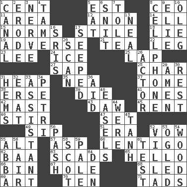 ACROSS 1. Penny 5. Eastern Standard Time (abbr.) 8. Corporate head (abbr.) 11. Type of rug 12. Soon (poet.) 14. Pipe bend 15. Typical models 17. Vertical member of a panel or frame 18. Untruth 19. Contrary to your interests or welfare 21. Afternoon social gathering 22. Part of a journey 23. Area sheltered from the wind 24. Frozen water 25. Pet locale 27. Plant excrement 28. Burn to charcoal 31. Pile 35. Teachers' org. 37. Heavy book 38. Celtic language 39. Pass on 41. Washington bills 42. Vertical spar for supporting sails 43. Obsolete 45. Monthly bill 46. Commotion 47. Put into a specified state 49. Small drink 51. Period 52. Promise 55. Keyboard modifier key 57. Viper 60. Small, flat, pigmented spot on the skin 62. Sound made by sheep 63. Loads 65. Phone greeting 66. Storage container 67. Opening into or through something 68. Downhill vehicle 69. Tate display 70. "___ Little Indians" 71. Small boys DOWN 1. Lessep's creation 2. Eat (away) 3. Effrontery 4. Docile 5. Erode 6. In a ____ (agitated or irritated) 7. Lacquered or enameled metalware 8. Portable communications device 9. Writer Wiesel 10. Cassini of fashion 13. Be tempered by heat 16. Indian titles of respect 17. Oozed 20. Examine minutely or intensely 26. Thespian 29. So be it 30. Remainder 31. Is hesitant and indecisive 32. Part of Q.E.F. 33. Helper 34. _ dish (used to culture cells) 36. Help 40. Artist's stands 44. We are 48. Hyperbolic tangent 50. Romantic infatuation 52. Country residence 53. Stared at amorously 54. Forest 55. Swedish rock group 56. Den 58. Native of Scotland 59. Light colored 61. Trial 64. Lair
