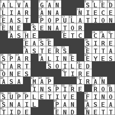 ACROSS 1. Inventor's middle name 5. Separate the seeds from cotton 8. Downhill vehicle 12. One who doesn't tell the truth 13. Santa ___, CA 14. Sibling's daughter 15. 90 degrees 16. Census information 19. Compass dir. 20. Elected representative 21. American tennis player Robert 23. And so on (abbr.) 24. Feline 27. Relaxation 30. Beget 31. Michaelmas daisies 34. Singer James 35. Coast Guard woman 38. Place in a line 40. Sight organs 41. Small pie 42. Dirtied 44. Singles 45. Become fatigued 46. White ___ sheet 47. Atlas unit 50. SW Asia republic 53. Stimulate to action 57. Director Reiner 59. Supplementary 63. A pale, very dry sherry 64. Slow-paced one 65. Baking dish 66. At sea 67. Event that recurs at intervals 68. Conclude 69. Remaining after all deductions DOWN 1. Toward shelter 2. Woody, climbing, usually tropical plant 3. Flower holders 4. Nonscientific branch of learning 5. Open wide 6. At once, immediately (arch.) 7. California wine valley 8. Be seated 9. Luau accessory 10. Environmental prefix 11. Lair 14. Drug cop 17. Shoshoni 18. Car dealer's back yard 20. Oceans 22. Centers of feelings and intuitions 24. Municipality 25. Johnson of "Laugh-In" 26. Afternoon social gatherings 28. R.R. building 29. Snakelike fish 30. Sowing specialist 32. _ de Janeiro 33. In a ____ (agitated or irritated) 35. Portico 36. Zero-star reviews 37. Type of rug 39. Biblical high priest 43. 4th largest of the Great Lakes 47. Place where flour is made 48. One (Scot) 49. Pacific Standard Time (abbr.) 51. Get up 52. Music written for nine 54. Corncob 55. _ the terrible 56. Tear apart 58. Water vessel 59. Fast jet (abbr.) 60. Single; one (prefix) 61. Groovy apt. 62. Sliced dessert 63. Avid follower